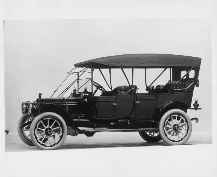 8x10 black and white print copied from a glass negative of a 1912 Packard 6 left side, top raised. Inscribed on photo back: 6-cylinder, 48-horsepower, 133-inch wheelbase, 7-person touring car, fitted with Packard storm-tilt windshield, & standard top.