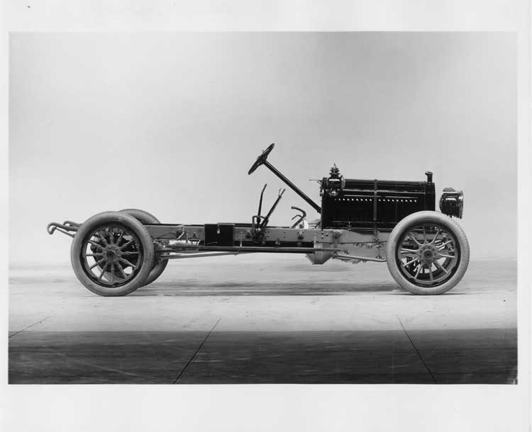 8x10 black and white print copied from a glass negative of a 1912 Packard 6 chassis, with hood cover. Inscribed on photo back: 6-cylinder, 48-horsepower, 133-inch wheelbase, chassis, right side elevation.