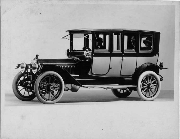 1913 Packard 48 two-toned brougham, right side, male driver & two female passengers