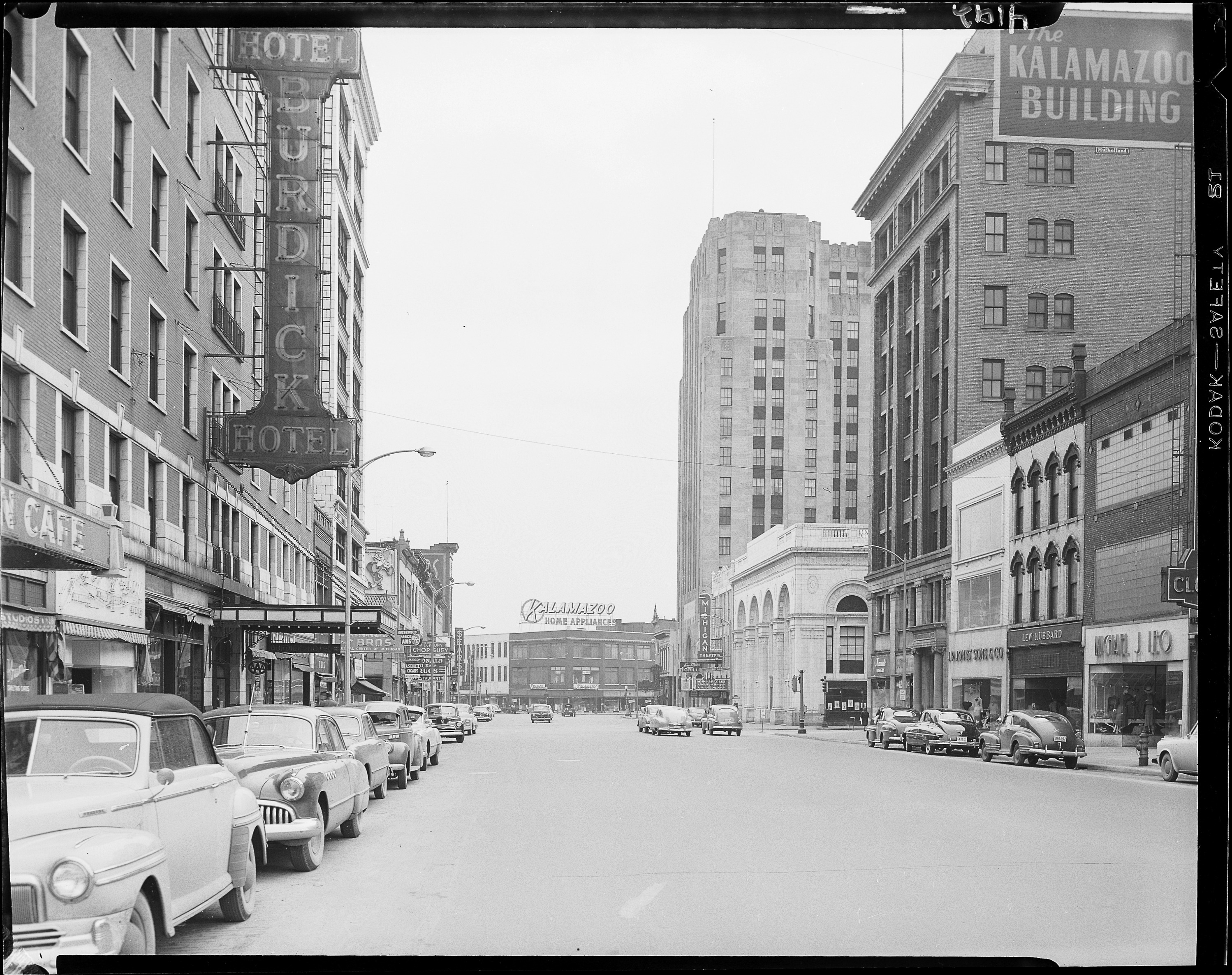Street Scenes - Service Stations. Looking East toward Portage Street intersection. Bview includes neon sign on front of Burdick Hotel on north side of street; facades of Michael J. Leo's, Lew Hubbard, J/R. Jones & Sons, The Kalamazoo Building, First National Bank and Trust, Michigan Theatre, and American National Bank on south side of street. Automobiles line two-way street. Client: (Photographic Negative)
