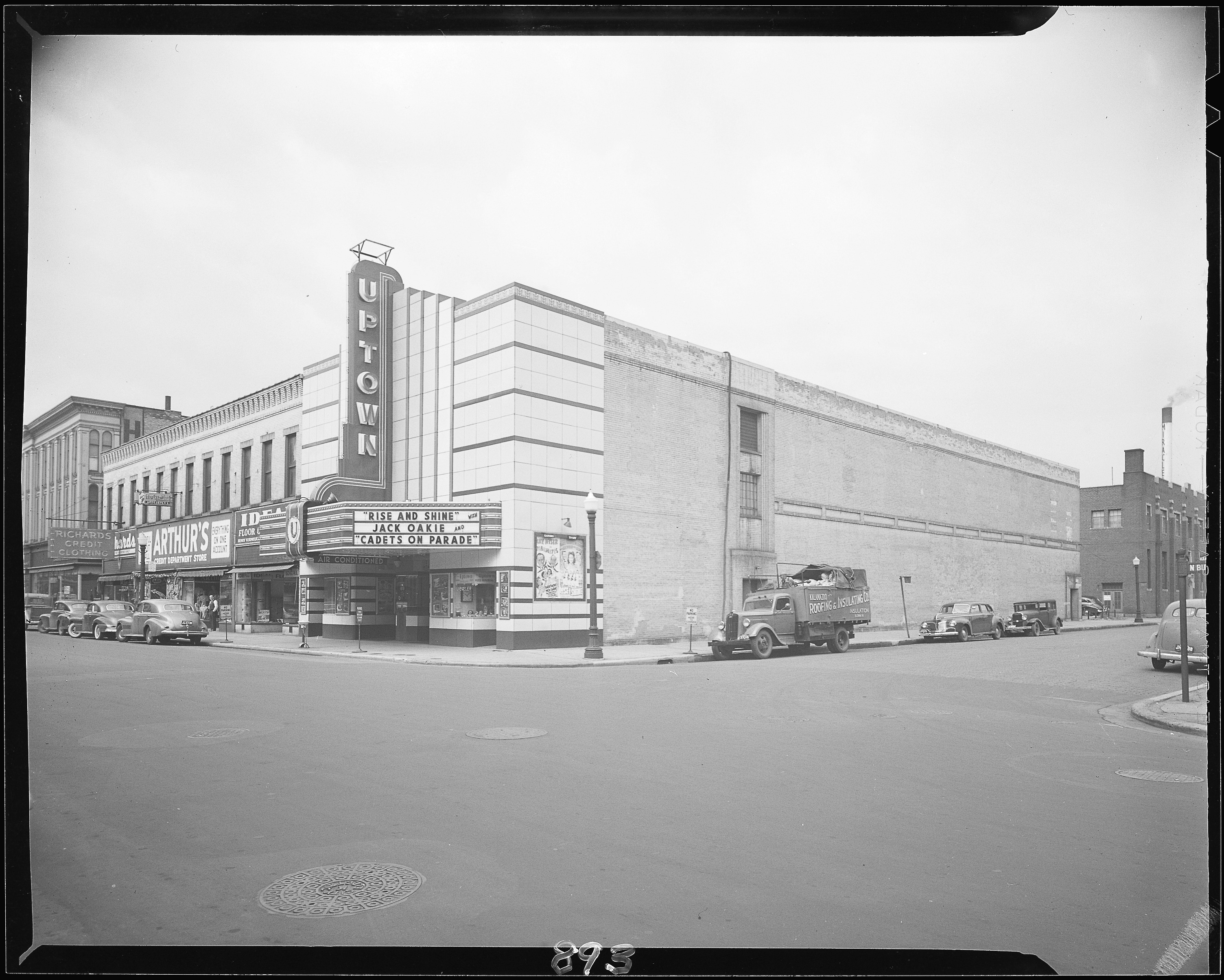 Street Scenes - Service Stations. Burdick Street. Uptown Theatre 247 N. Burdick, SW corner of Eleanor. Art Deco neon sign and building. Façade of block to south contains Ideal Floor Covering, Arthur's Department Store, Richard's Credit Clothing. Kalamazoo Roofing truck parked on Eleanor. Partial view of Salvation Army building on N. Rose Street. Client: Kalamazoo Roofing Company (Photographic Negative)