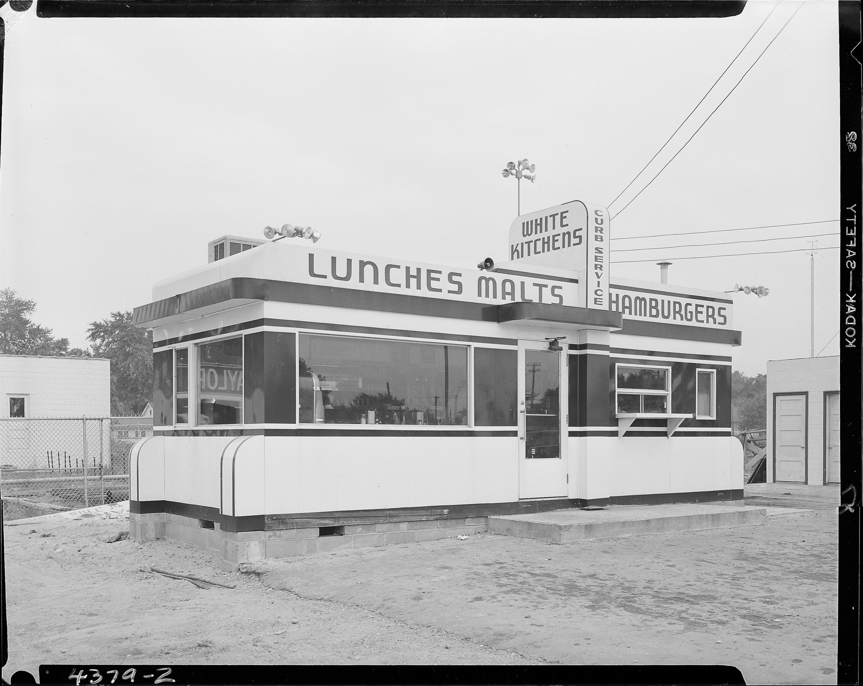 Street Scenes - Service Stations. White Kitchens, 1350 King Highway. Art Deco style diner featuring lunches, malts, hamburgers, and curb service. Client: Troff, McKessy and Lilly (Photographic Negative)