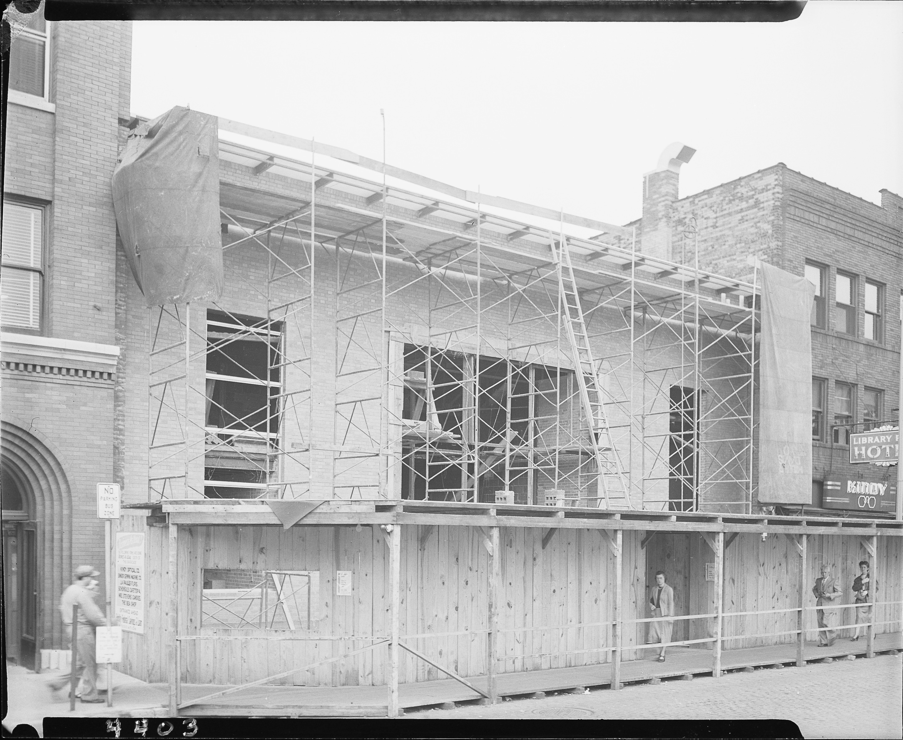 Street Scenes - Service Stations. Exterior view of construction of Fidelity Federal Savings and Loan Association, 315 South Burdick Street, includes scaffolding. Library Park Hotel, 321 South Burdick, and Kindy Optical Company, 323 South Burdick, also visible. Client: Fidelity Loan Association. (Photographic Negative)
