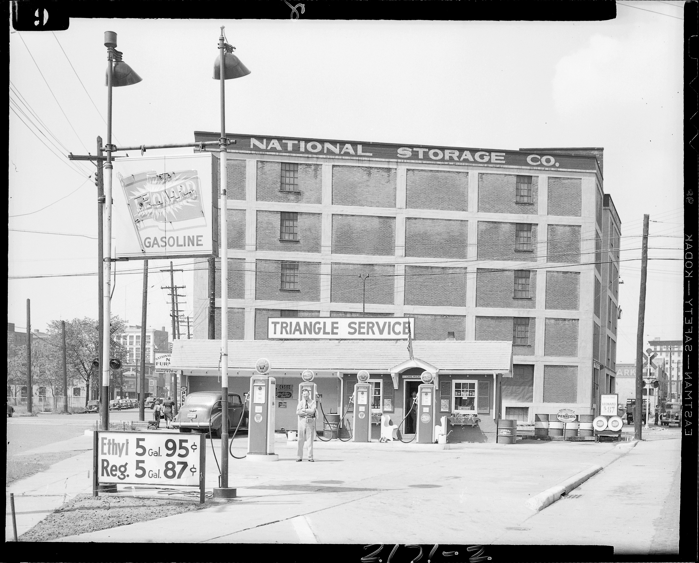 Street Scenes - Service Stations. Triangle Service Station, 315 Kalamazoo Avenue at intersection of East Water Street. Owner Les Rice is standing in front of station, and National Storage Company is visible in background. Client: Leonard Refining Company Inc. (Photographic Negative)