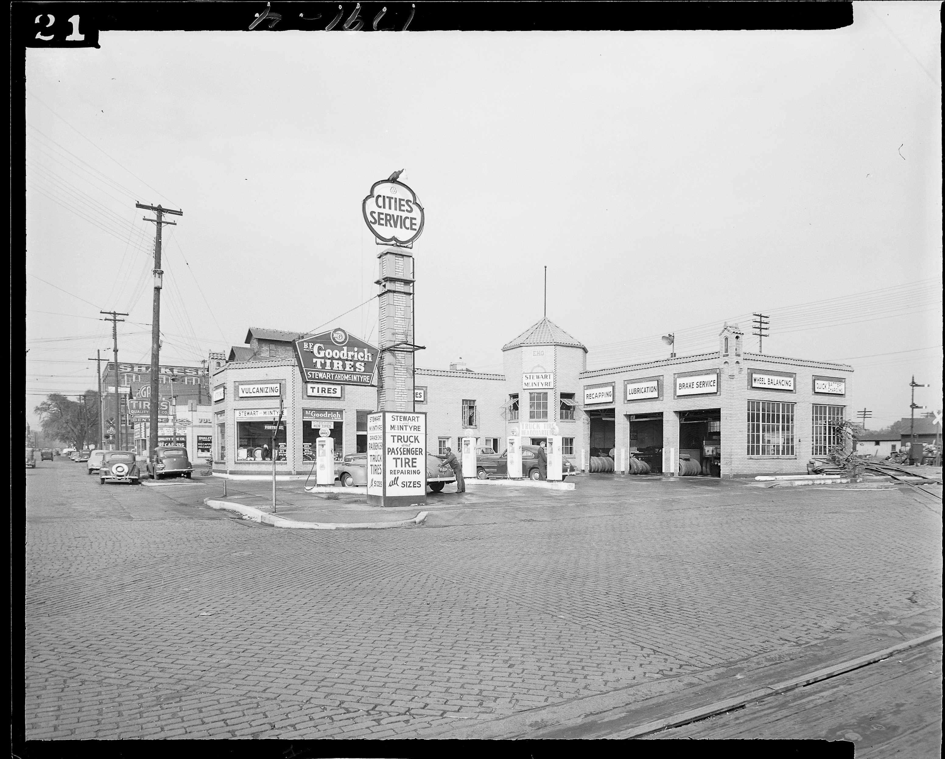 Street Scenes - Service Stations. Exterior of Cities Service Station, 355 E. Kalamazoo Ave near the intersection of Porter, includes sign for Goodrich Tires. Streets are paved in brick. Client: Stewart & McIntyre (Photographic Negative)