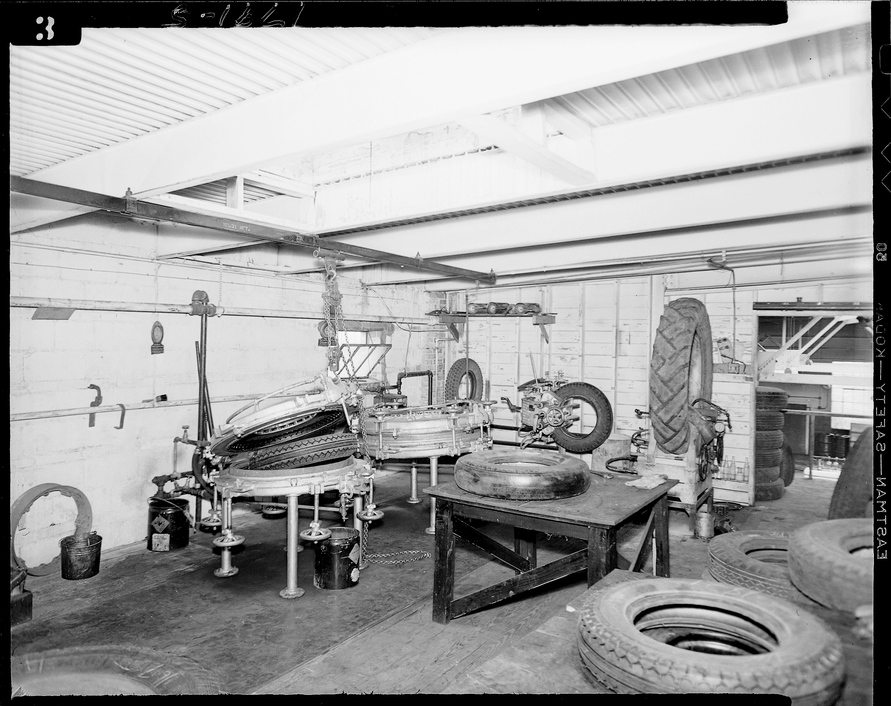 Business Scenes. Street Scenes - Service Stations. Interior tire repair shop, Cities Service Station, 355 E. Kalamazoo Avenue Client: Stewart & McIntyre (Photographic Negative)