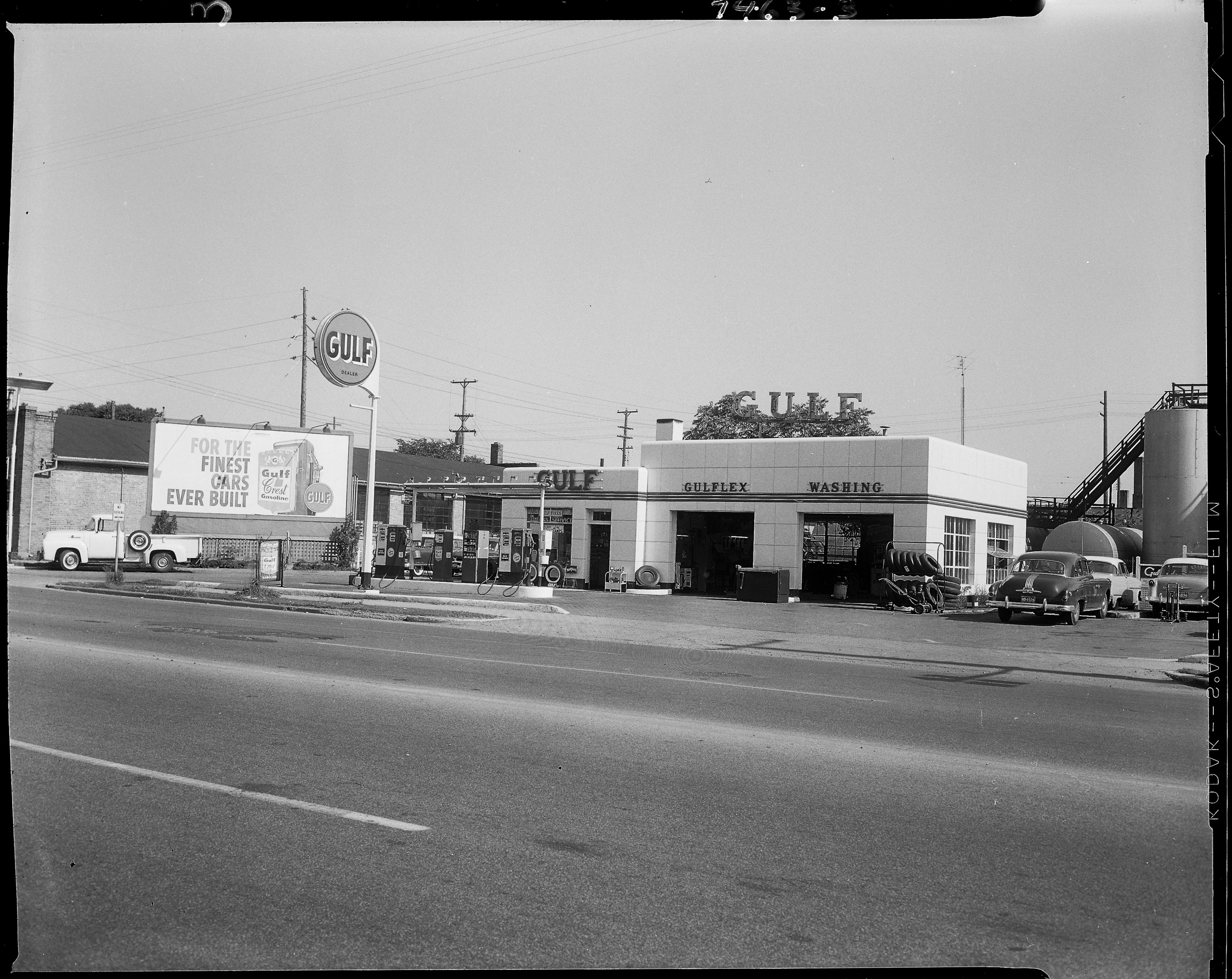 Street Scenes - Service Stations. Business Scenes. Exterior view of Specks Gulf Service Station, 640 East Michigan, Kalamazoo, Michigan. Client: Gulf Oil Company (Photographic Negative)