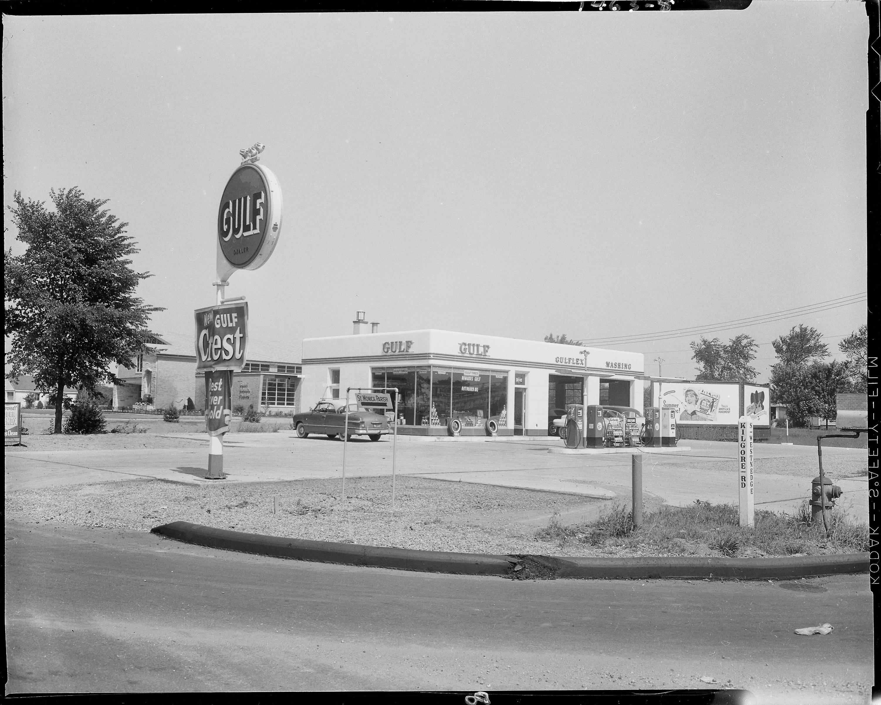 Street Scenes - Service Stations. Business Scenes. Exterior view of Howard's Gulf Service Station, 4438 S. Westnedge at intersection of Kilgore and Westnedge, Kalamazoo, Michigan. Billboard for New Era Potato Chips in background. Client: Gulf Oil Company (Photographic Negative)
