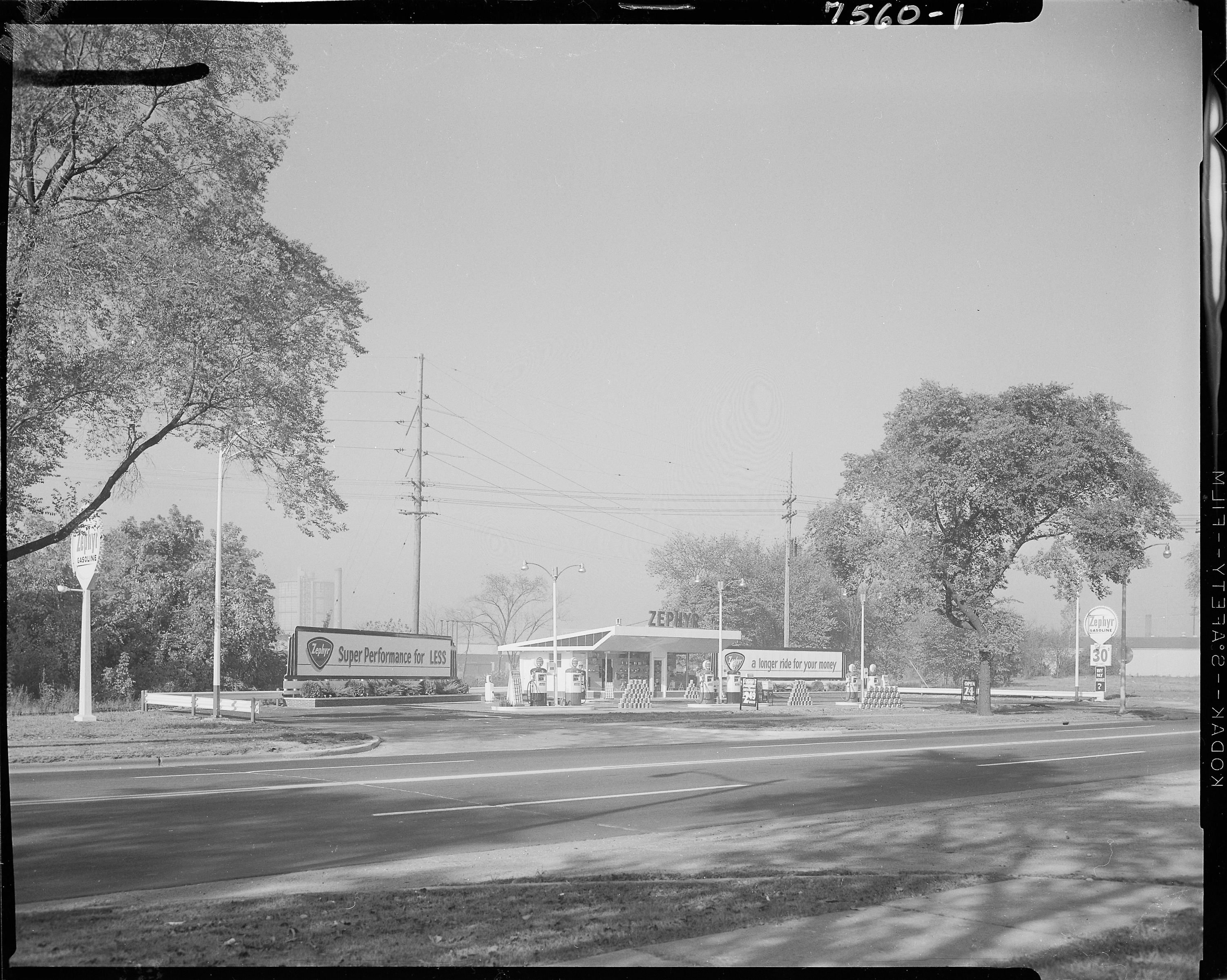 Street Scenes - Service Stations. Service Station. New Zephyr Gas Station, 928 King Highway, Kalamazoo, Michigan. Client: Naptha - Sol. Refining Company, Muskegon, Michigan (Photographic Negative)