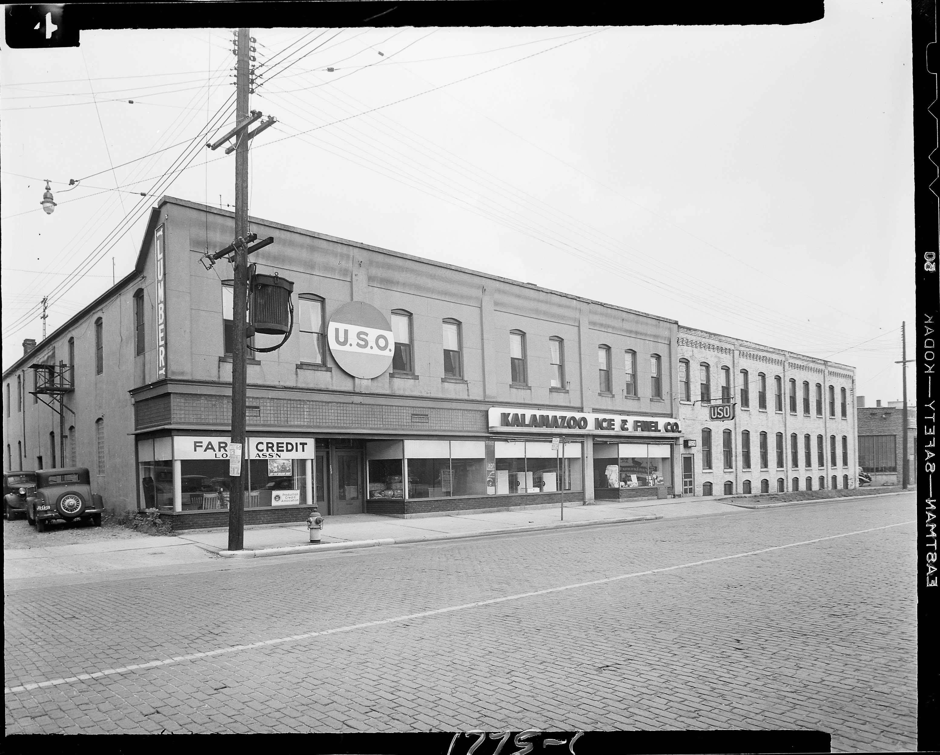Street Scenes - Service Stations. Exterior of Kalamazoo Ice & Fuel, 131 E. Kalamazoo Avenue, includes facades of Southwestern Michigan Production Credit Association, 121 E. Kalamazoo Avenue, and the Kalamazoo USO (United Service Organizations). Client: Kalamazoo Ice & Fuel (Photographic Negative)