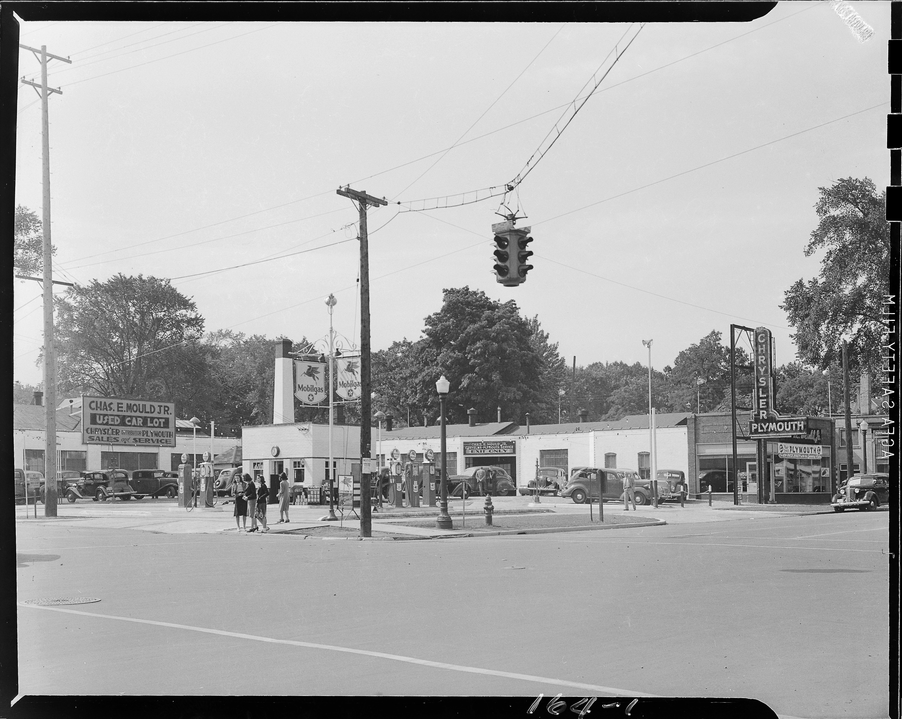 Street Scenes - Service Stations. Southwest corner of West Michigan Avenue and Westnedge Avenue with pedestrians, traffic light, and automobiles. Businesses include Charles E. Mould, Jr., Chrysler and Plymouth Motor Cars, 126 S. Westnedge Avenue; Mobilgas Service Station, 501 W. Michigan Avenue; and Charles E. Mould, Jr., Used Car Lot, 513 W. Michigan. Client: Chas. E. Mould, Jr. (Photographic negative)