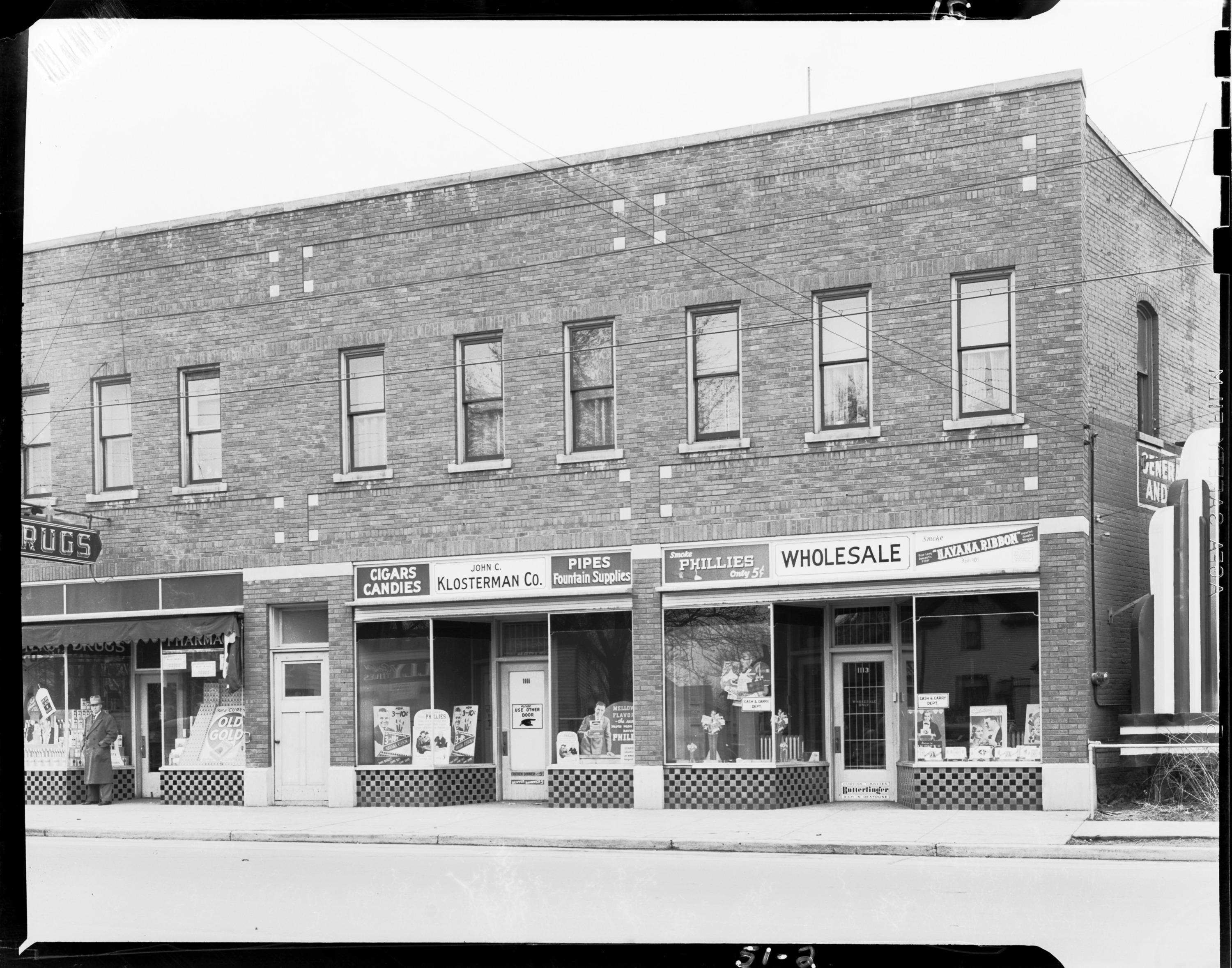 Street Scenes - Service Stations. Facade of John C. Klosterman Wholesale Tobacco, 1111 Portage, and Witter's Pharmacy, 1105 Portage. Client: Kalamazoo Gazette (Photographic negative)