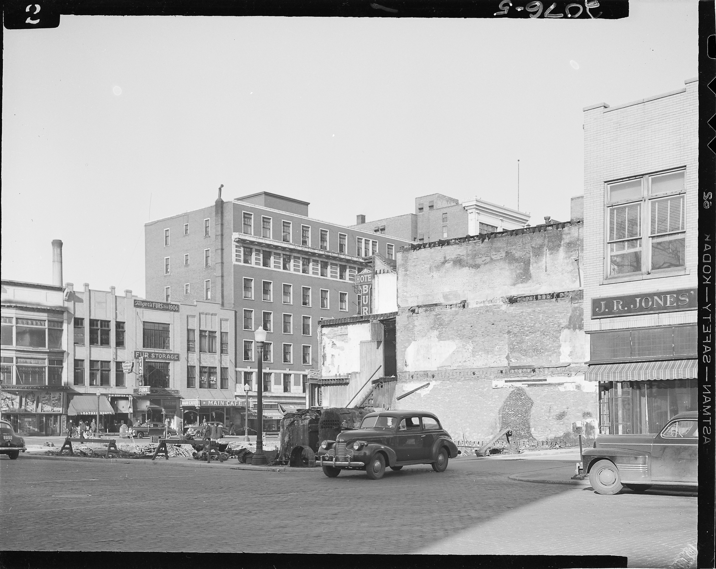 Street Scenes - Service Stations. View of Michigan Avenue, Rose Street, and Exchange place construction site includes facades of Burdick Hotel, 124 W. Michigan, Main Cafe, 140 W. Michigan, Fingers Fur Shop, Inc., 142 W. Michigan, and J. R. Jones, 123 S. Rose. Client: Sid Isaacs (Photographic Negative)