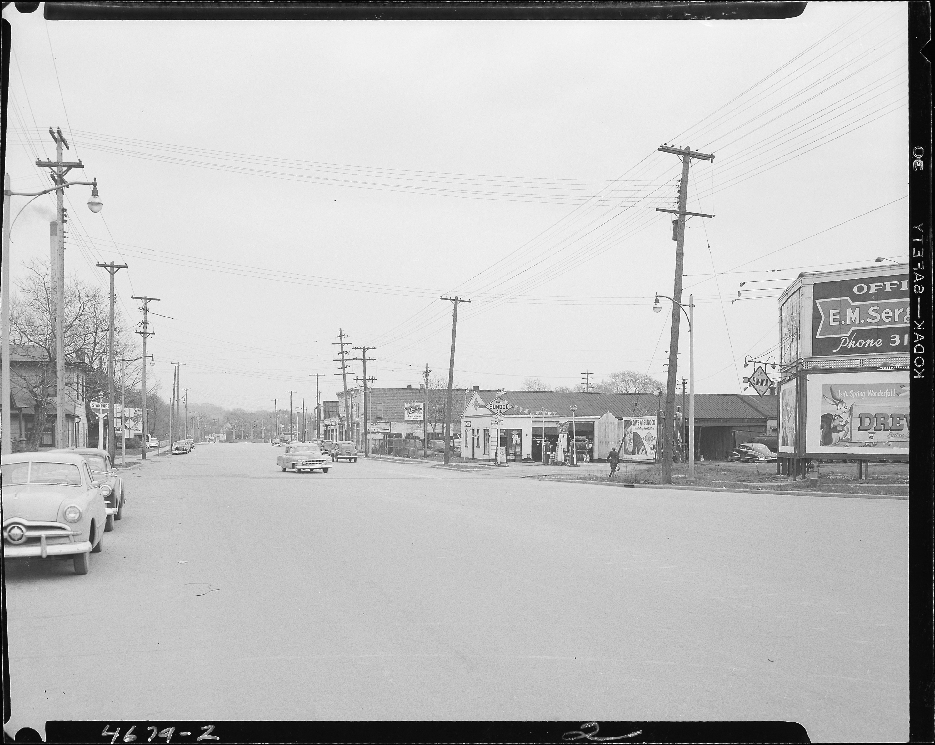 Street Scenes - Service Stations. East Michigan Avenue looking east, includes Hap & Dick's Sunoco, 572 E. Michigan, and O'Leary's Standard Service, 575 E. Michigan. Client: Jim Stanley (Photographic negative)