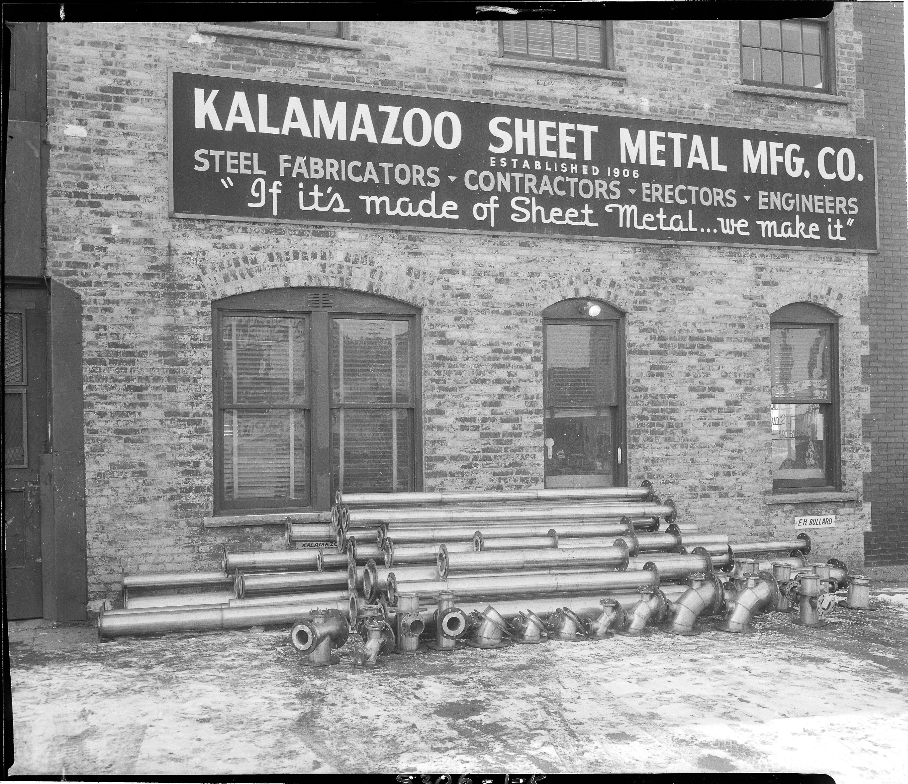 Street Scenes - Service Stations. Exterior view of Kalamazoo Sheet Metal Manufacturing Company, 301 W. Cedar, Kalamazoo, Michigan. Includes sample products in front of brick building façade. Client: (Photographic Negative)