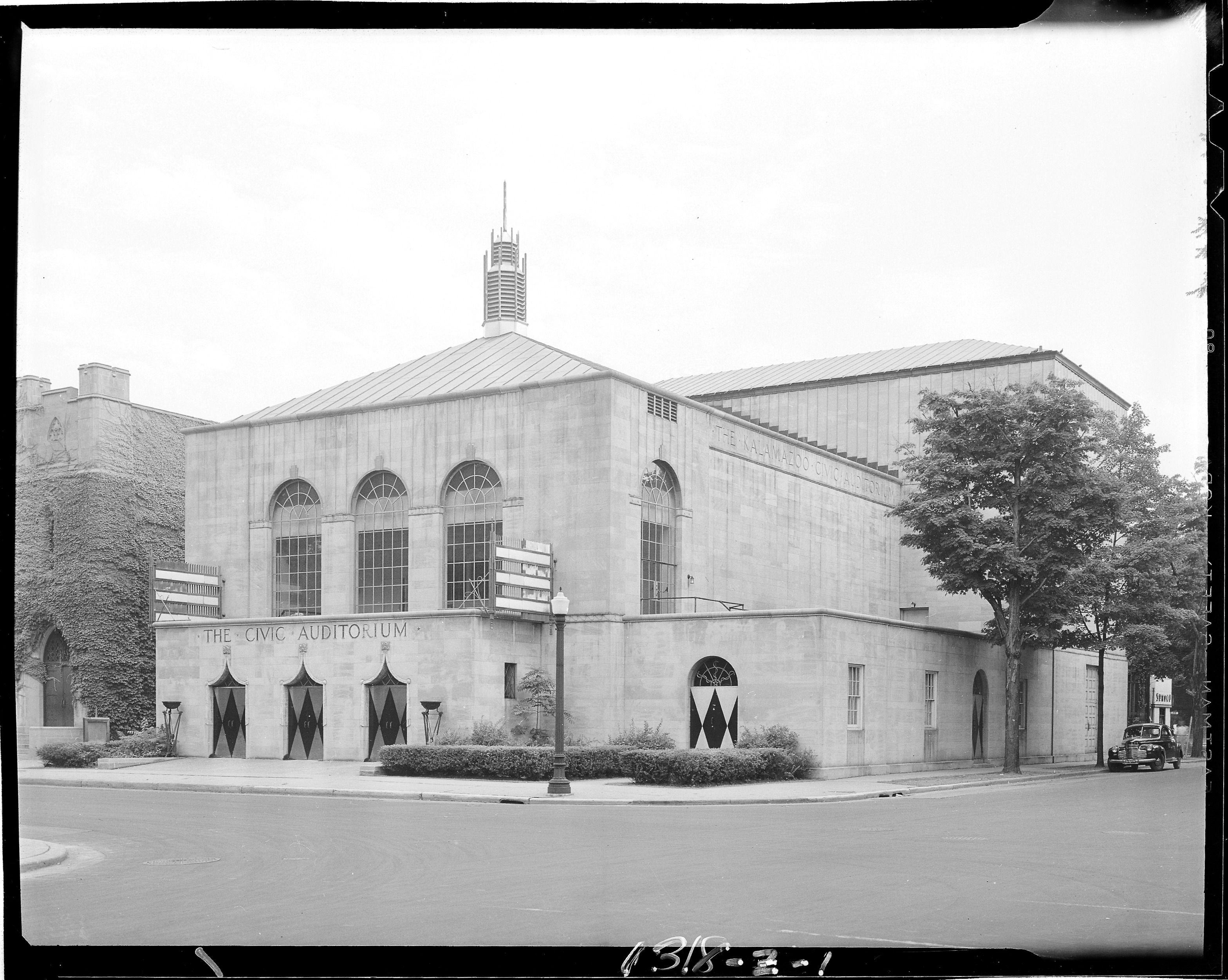 Street Scenes - Service Stations. Exterior view of The Civic Auditorium, 329 W. South Street, Kalamazoo, Michigan, corner of W. South Street and S. Park Street. Ivy-covered, stone facade of First Presbyterian Church, 317 W. South Street, partially visible. Blank marquee signs, street lamp, and parked automobile also visible. Client: Fidelity Savings & Loan Association, Kalamazoo, Michigan (Photographic Negative)