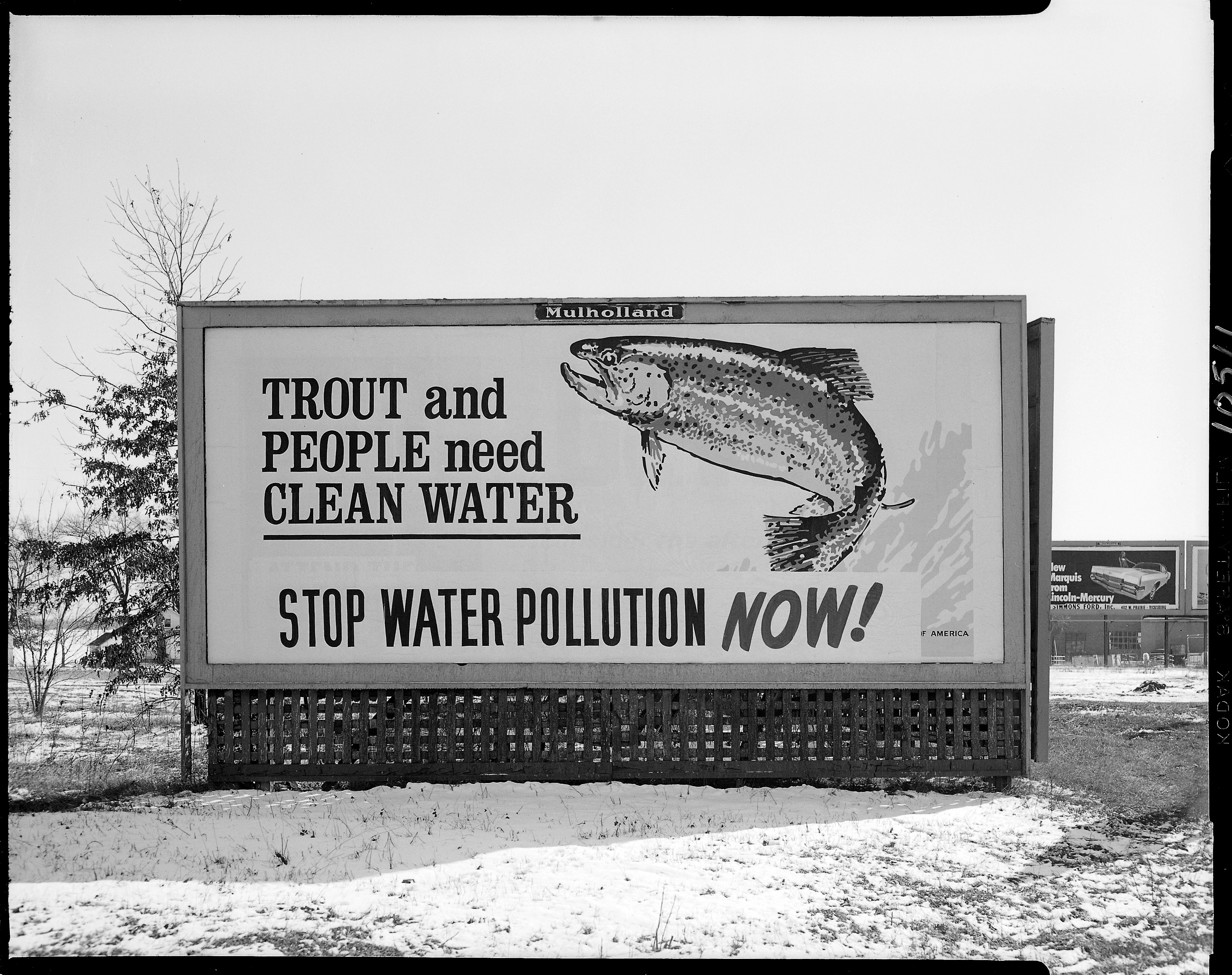 Advertising. Billboard by Mulholland Sign Company, ""Trout and People Need Clean Water, Stop Water Pollution, NOW!."" Also visible in background is partial view of billboard advertising ""New Marquis from Lincoln-Mercury"" for ""Simmons Ford, Inc., Vicksburg."" Client: Unknown, Kalamazoo County, Michigan (Photographic Negative)