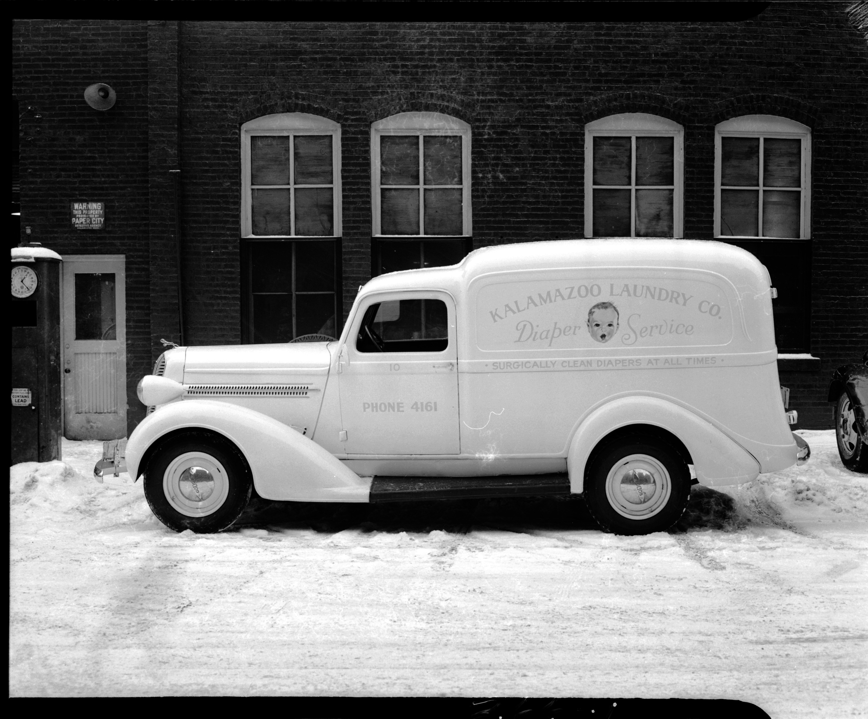 Advertising. Kalamazoo Laundry Company Diaper Service truck, Kalamazoo, Michigan. Client: Kalamazoo News Advertiser (Photographic Negative)
