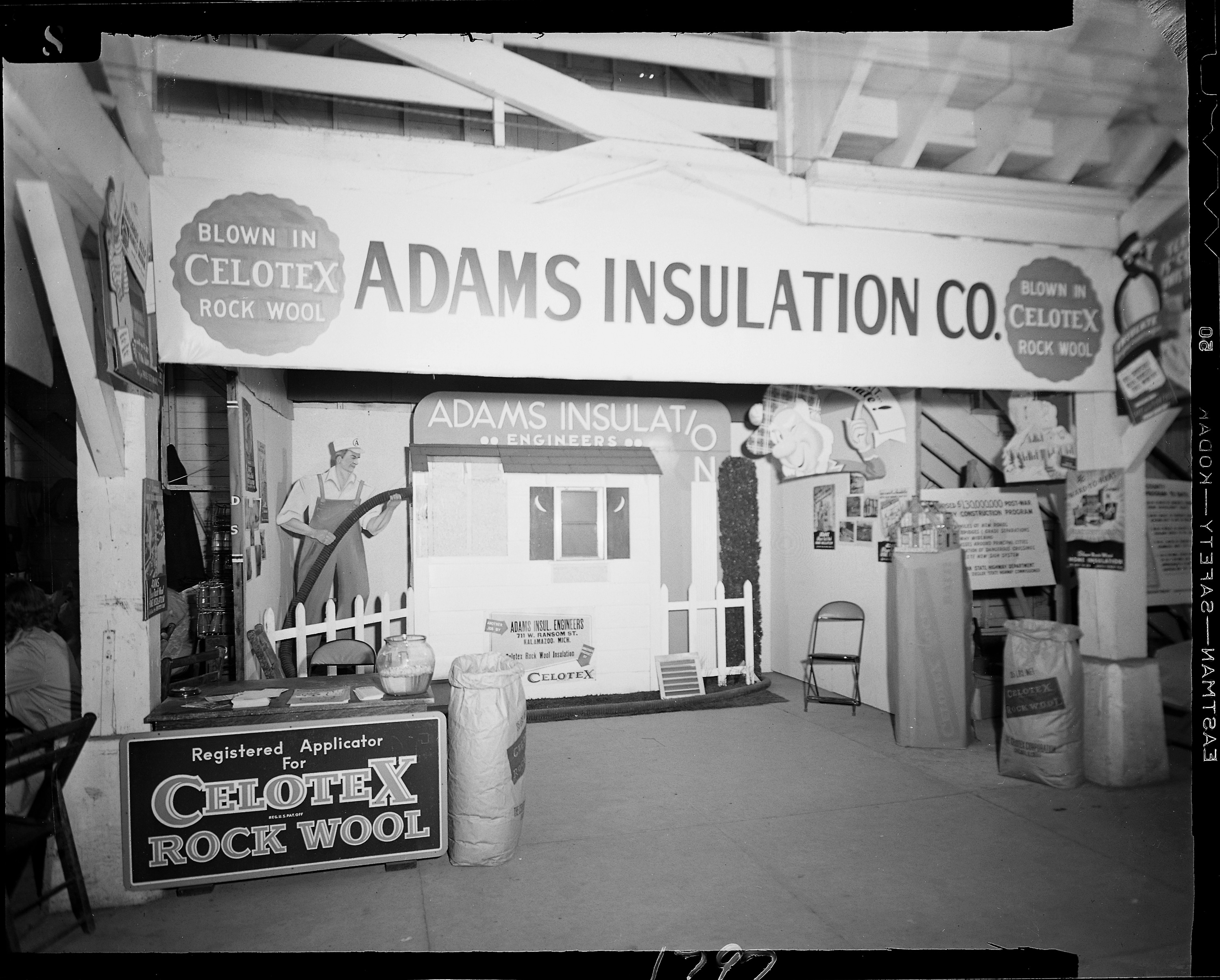 Advertising. Adams Insulation Company display at Kalamazoo County Fair promoting blown in Celotex Rock Wool insulation. Kalamazoo, Michigan. Client: Adams Insulation Co. (Photographic Negative)