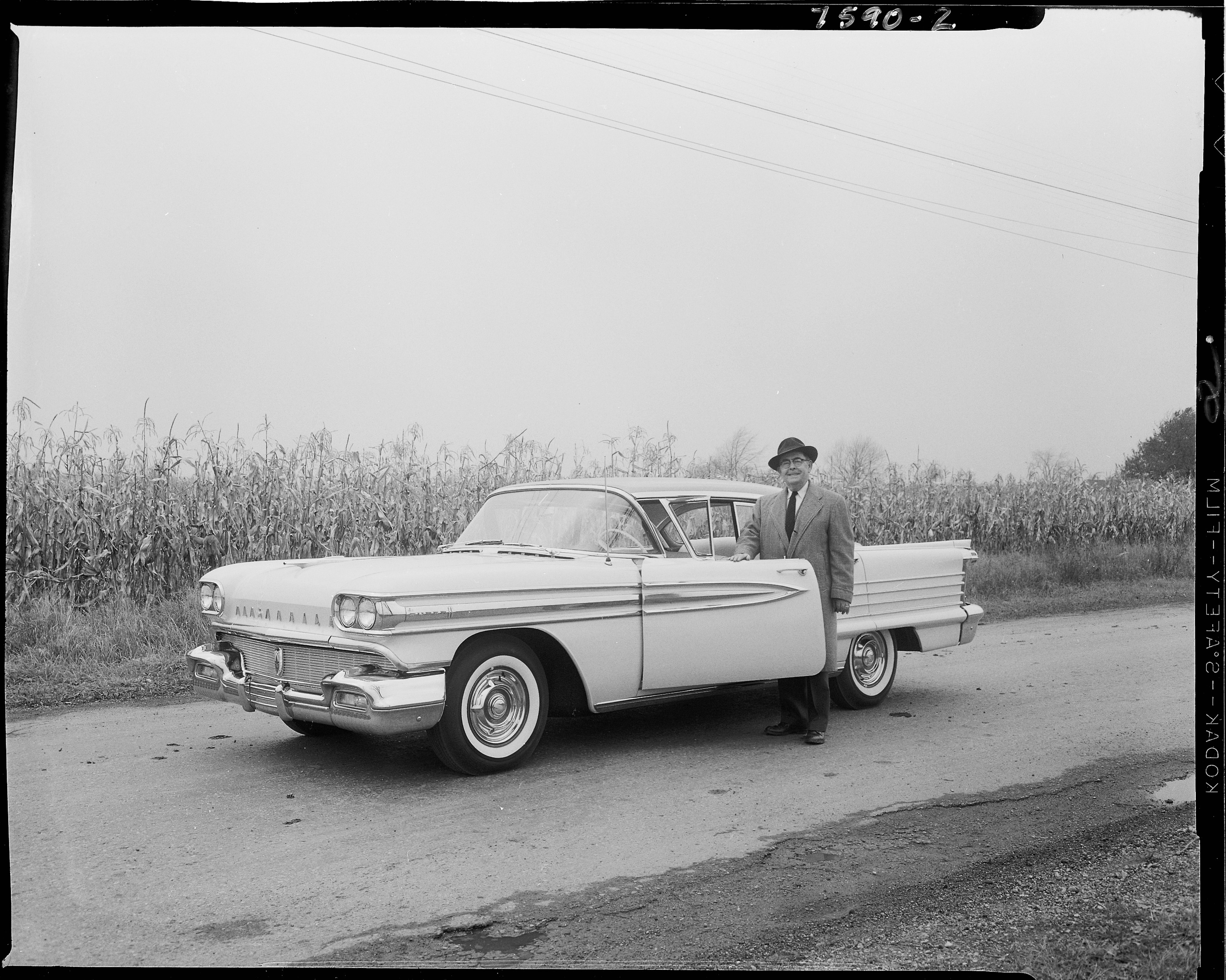 Advertising. People - Daily Life. Mr. Black with his new car in front of a cornfield. 1958 Oldsmobile Super 88, 4 door sedan. Client: Orrin B. Hayes, Oldsmobile Dealer (Photographic Negative)