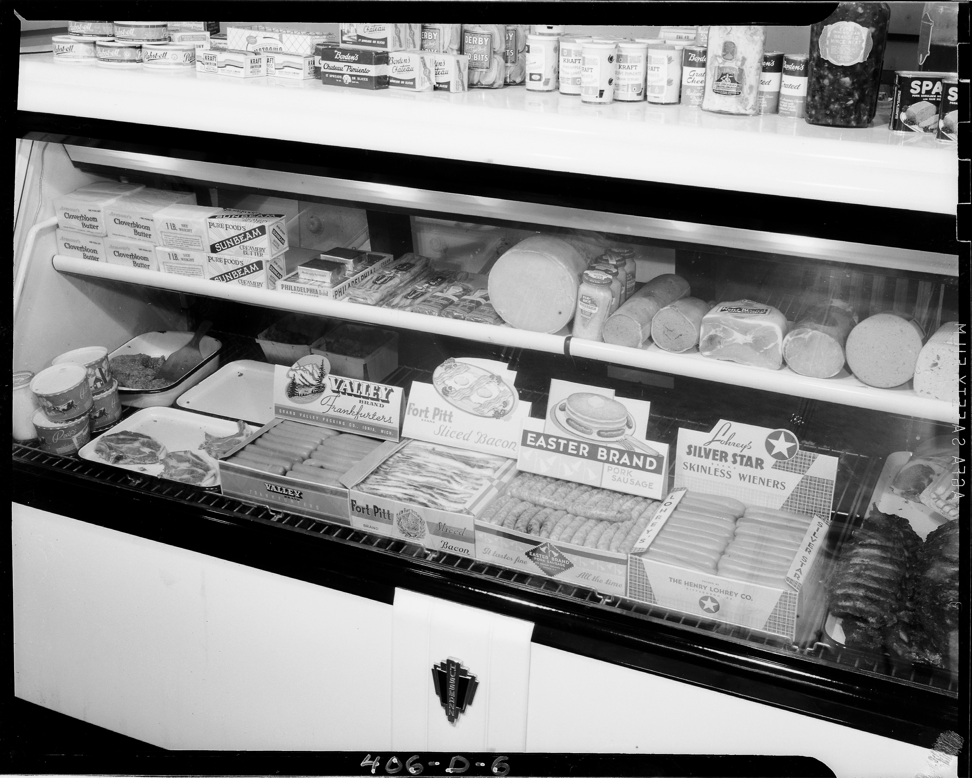 Advertising. Commercial refrigerator in store featuring Valley Frankfurters, Fort Pitt Sliced Bacon, Easter Brand Pork Sausage, Lohrey's Silver Star Skinless Wieners, Cloverbloom Butter, Sunbeam Creamery Butter, and Philadelphia Cream Cheese. Client: Sutherland Paper Company (Photographic Negative)