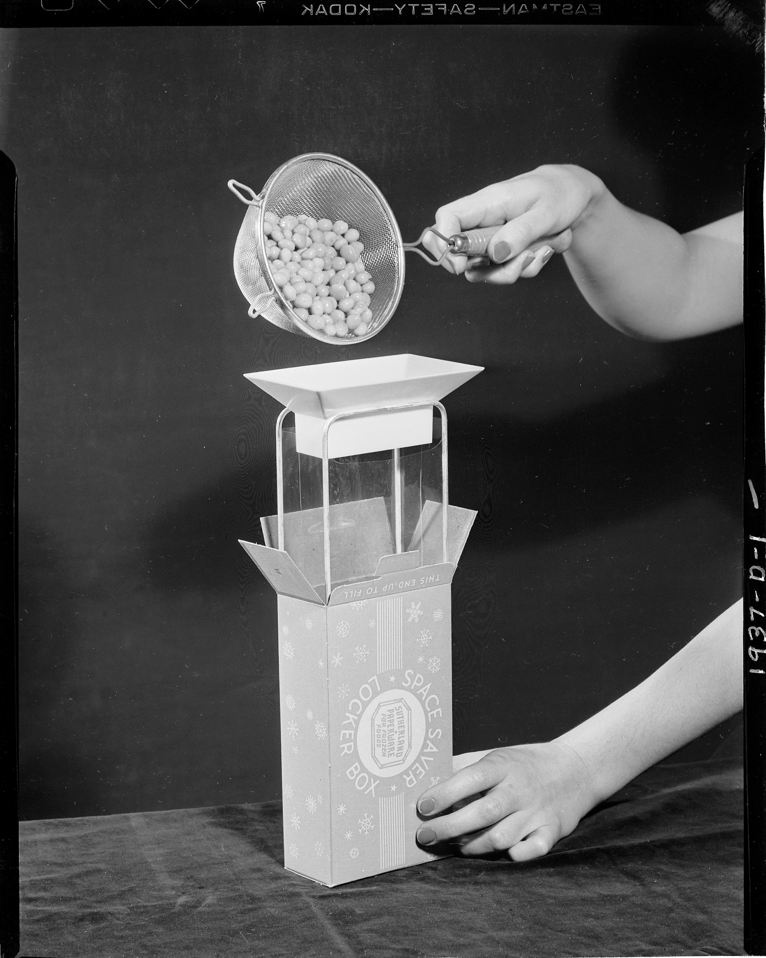 Advertising. Demonstration of Sutherland Paper Company paperware for frozen foods features model inserting food into opened ""Space Saver Locker Box."" Client: Sutherland Paper Company (Photographic Negative)