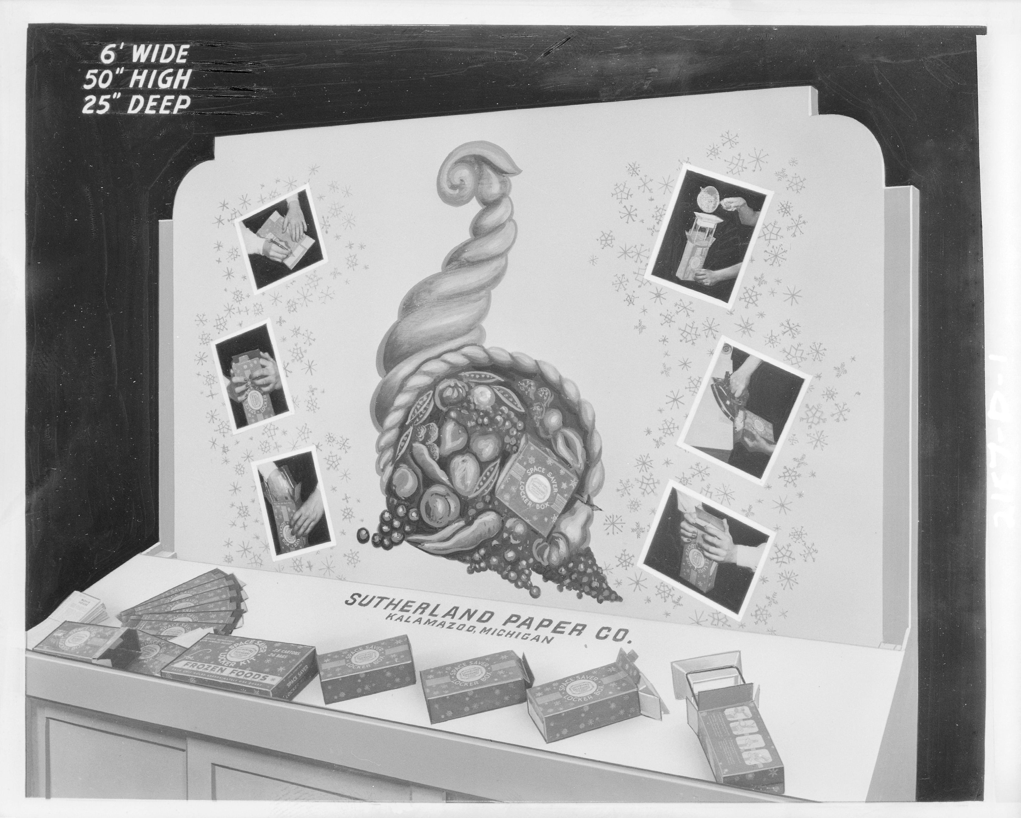 Advertising. Exhibit for Sutherland Paper Company features ""Space Saver Locker Box"" and ""Space Saver Locker Kit for Frozen Food."" Client: Sutherland Paper Company (Photographic Negative)