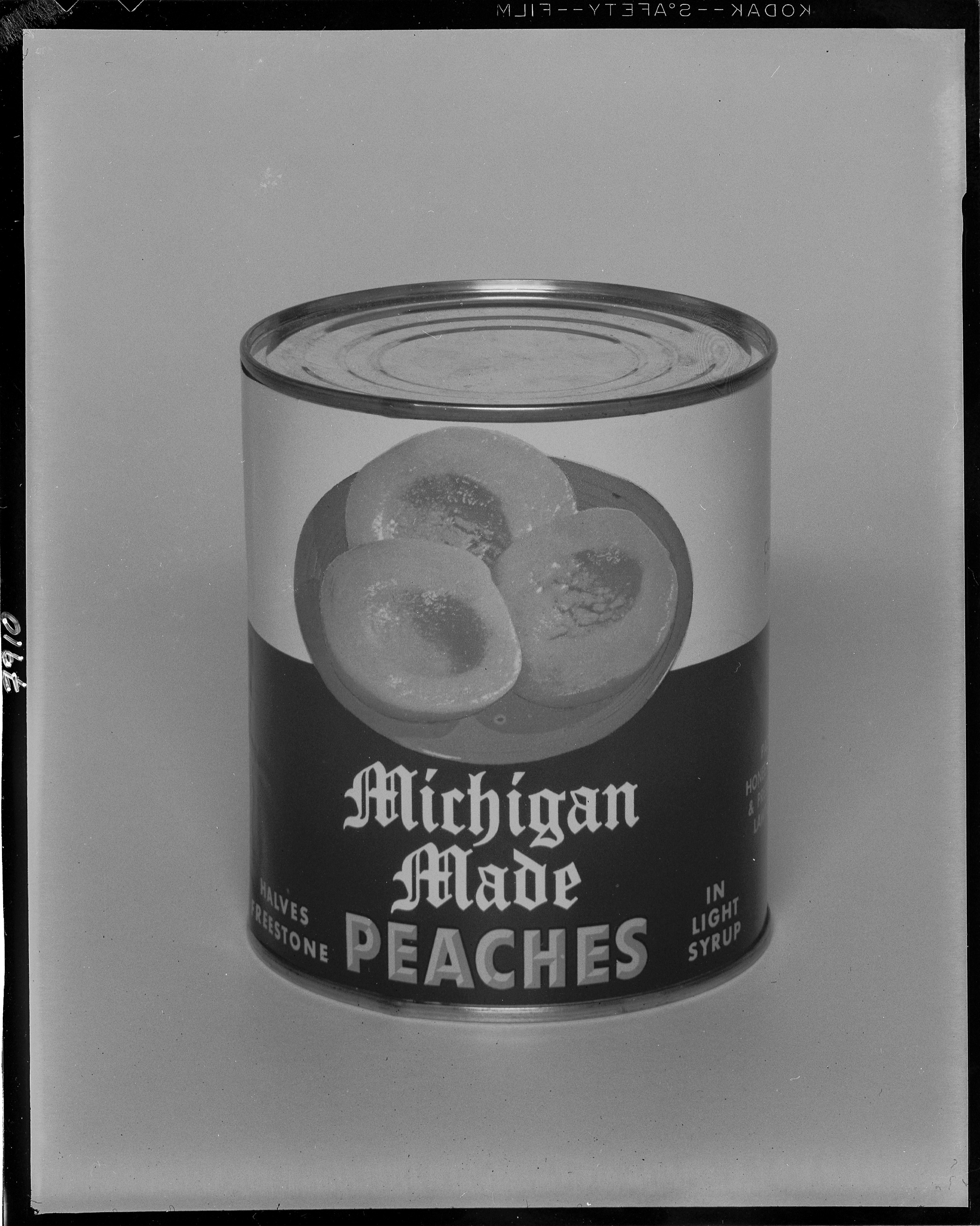Advertising. Photo of canned Michigan Made Peaches. Client: National Food Company (Photographic Negative)