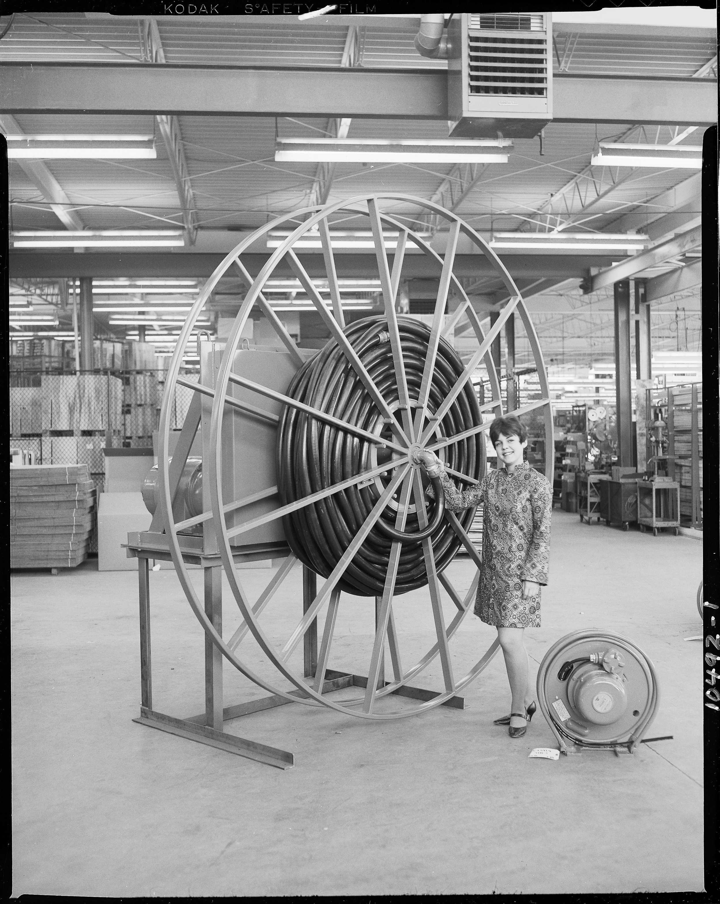 Industrial Scenes. Advertising. Woman standing next to large powered hose reel in warehouse. Client: Aero-Motive Manufacturing Company (Photographic Negative)