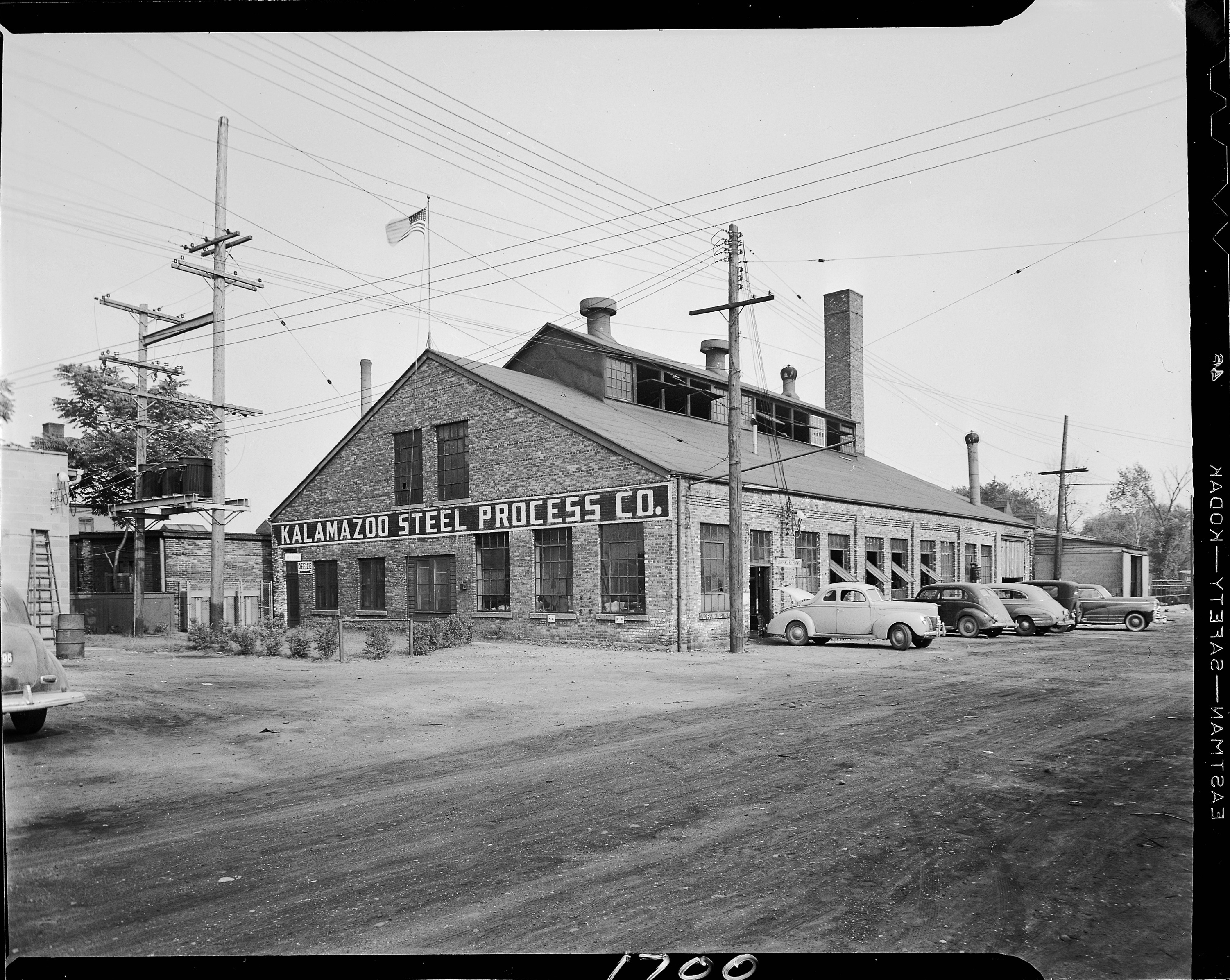 Industrial Scenes. Exterior of factory building and parked cars at 150 Blaine Street. Client: Kalamazoo Steel Process Co. (Photographic Negative)