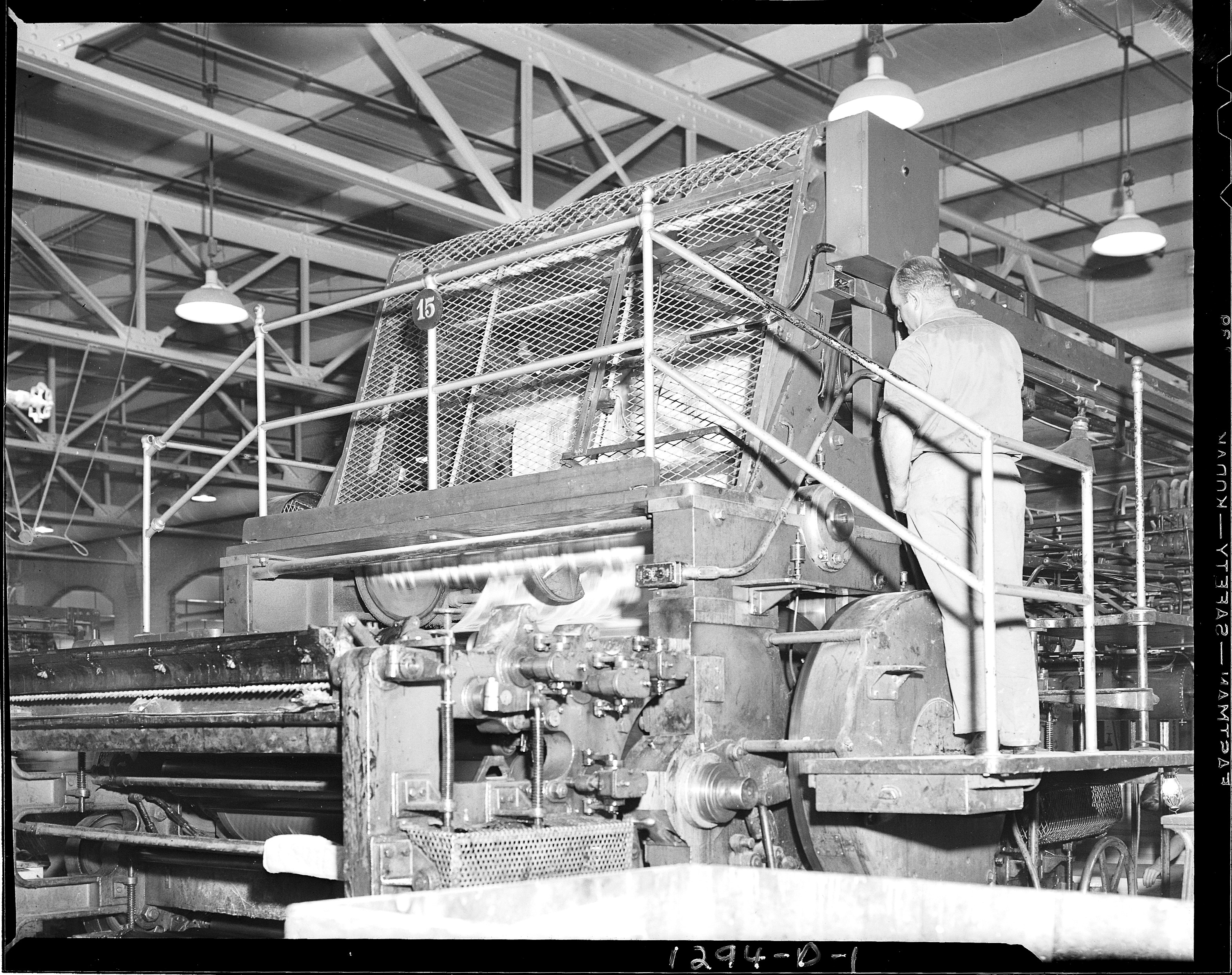 Industrial Scenes. Plant scene with worker at printing press for bank window. Client: Sutherland Paper Company (Photographic Negative)