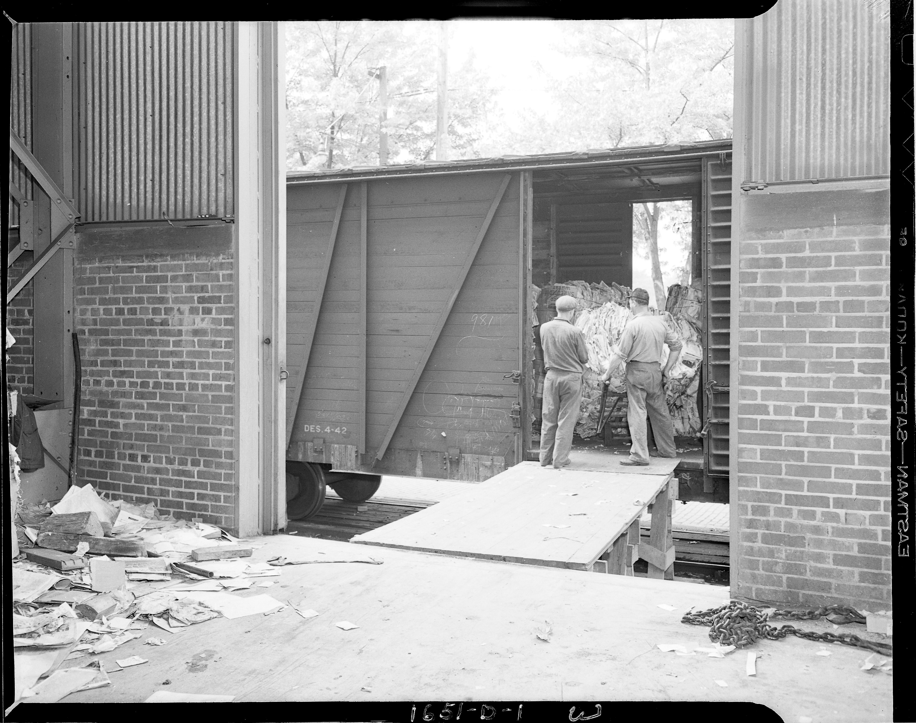 Industrial Scenes. Men loading paper scrap into train car. Client: Sutherland Paper Company (Photographic Negative)