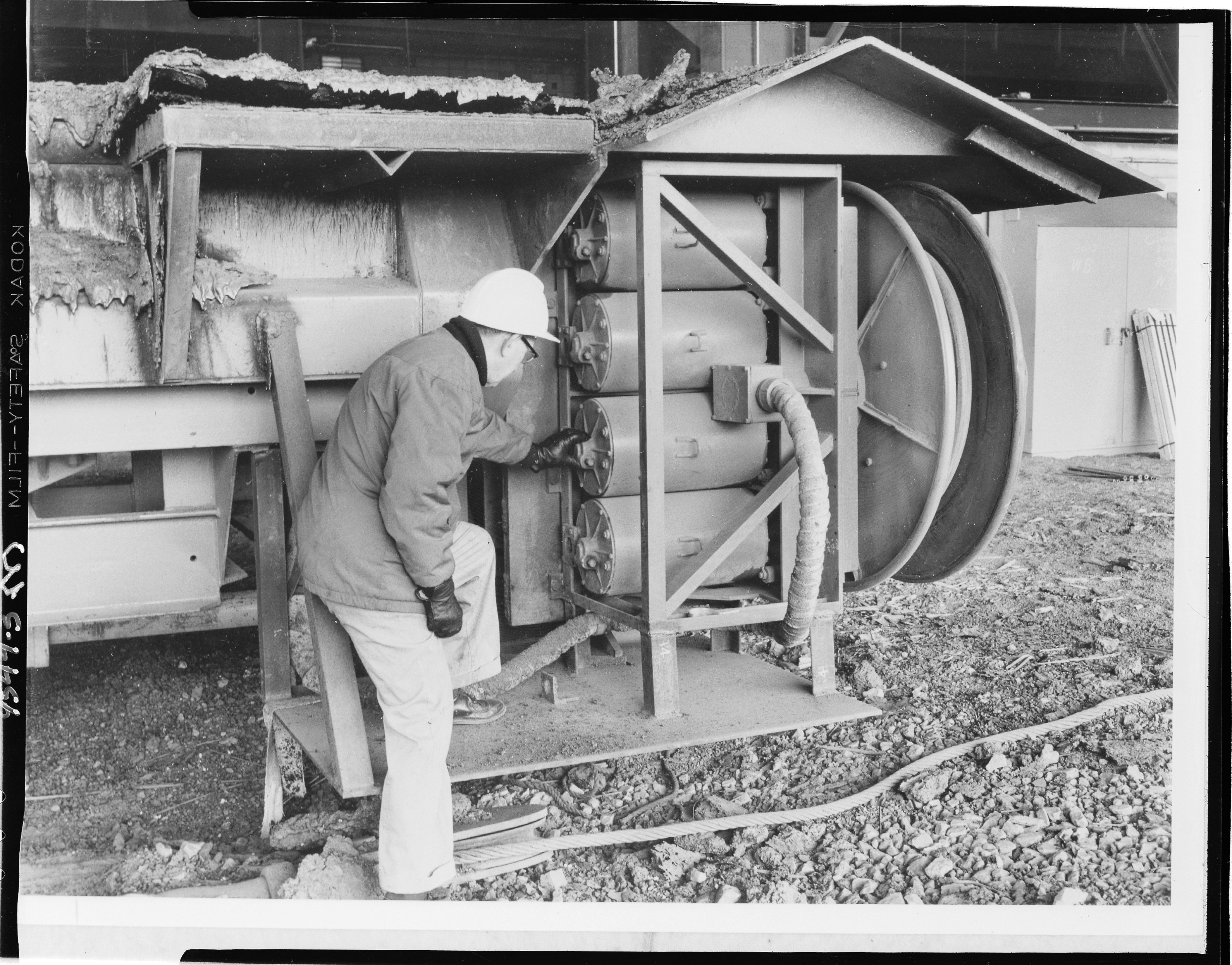 Industrial Scenes. Man wearing hardhat, coat, and gloves, outdoors examining steel mill reel components. Client: Aeromotive Manufacturing Company, Kalamazoo, Michigan. (Photographic Negative)