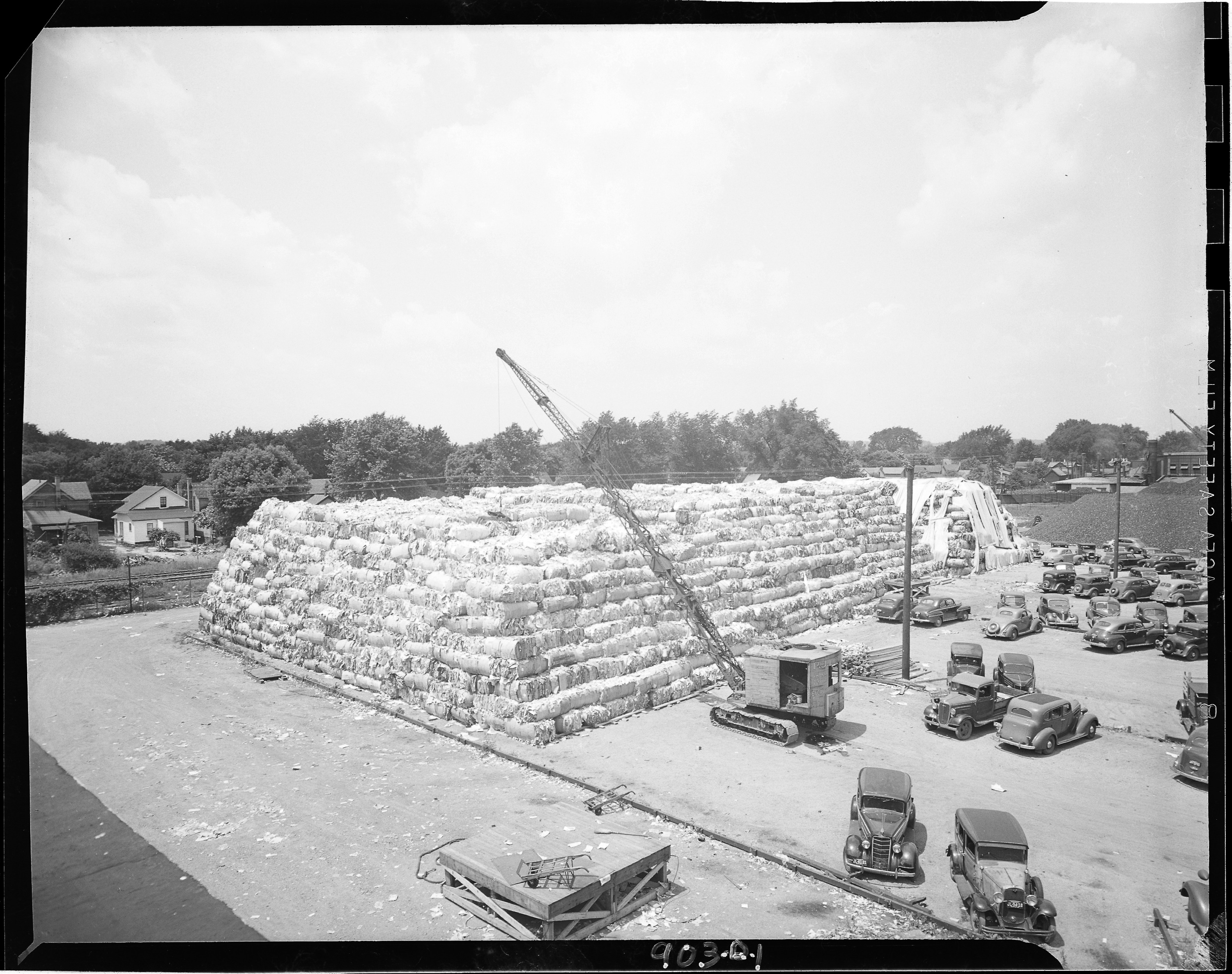 Industrial Scenes. Bails of shredded wastepaper next to parking lot with automobiles and a crane. Railroad tracks visible in background. Client: Sutherland Paper Company, Kalamazoo, Michigan. (Photographic Negative)