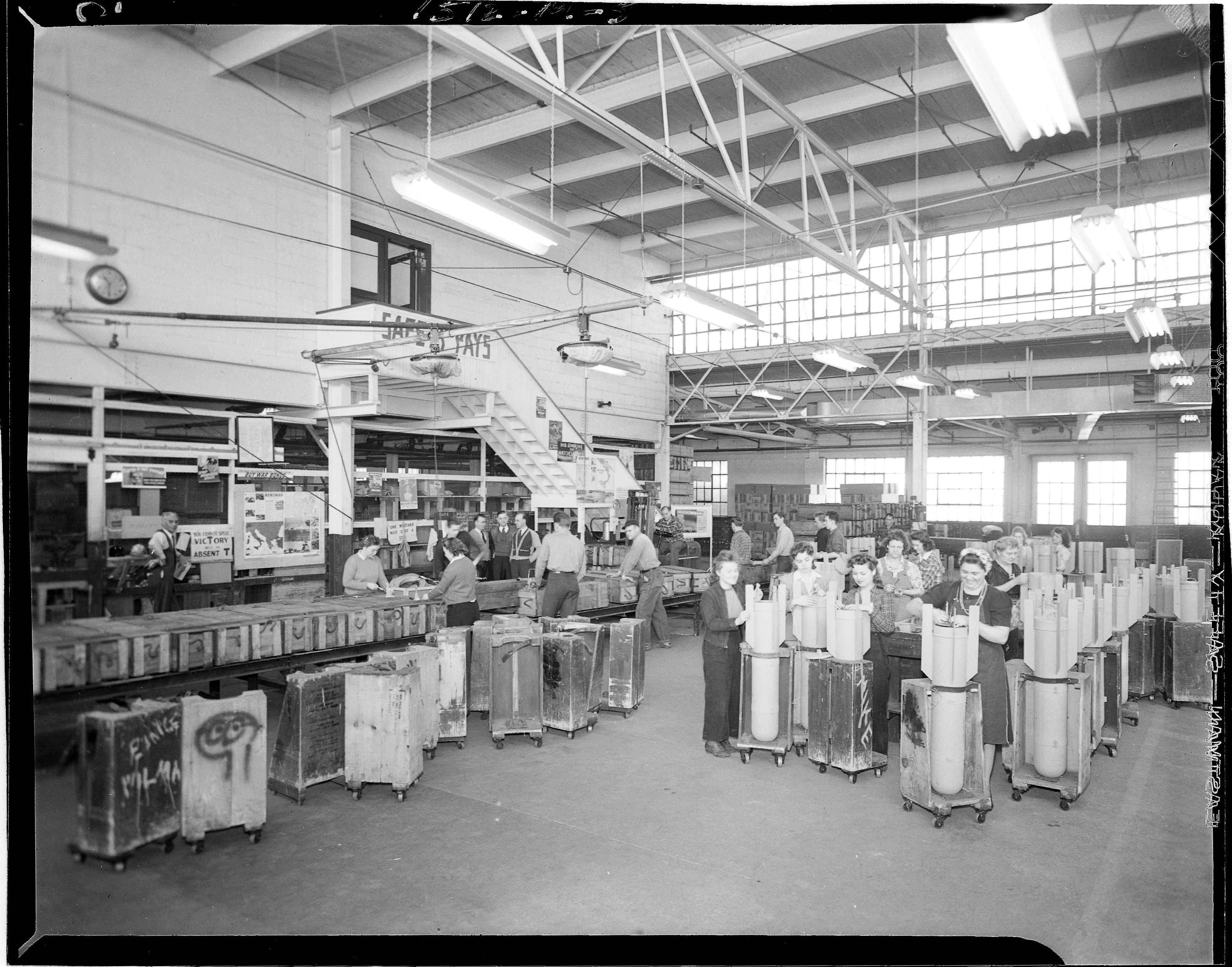 Industrial Scenes. People Working. Women and men loading AN-M26 parachute flares into wooden crates on conveyor belt at Kalamazoo Stove Company during WWII. Women loading AN-M26 parachute flares into outer casings. Male supervisor standing near sign that reads You can't spell Victory with an ABSENT T. Client: Kalamazoo Stove Company, Kalamazoo, Michigan. (Photographic Negative)