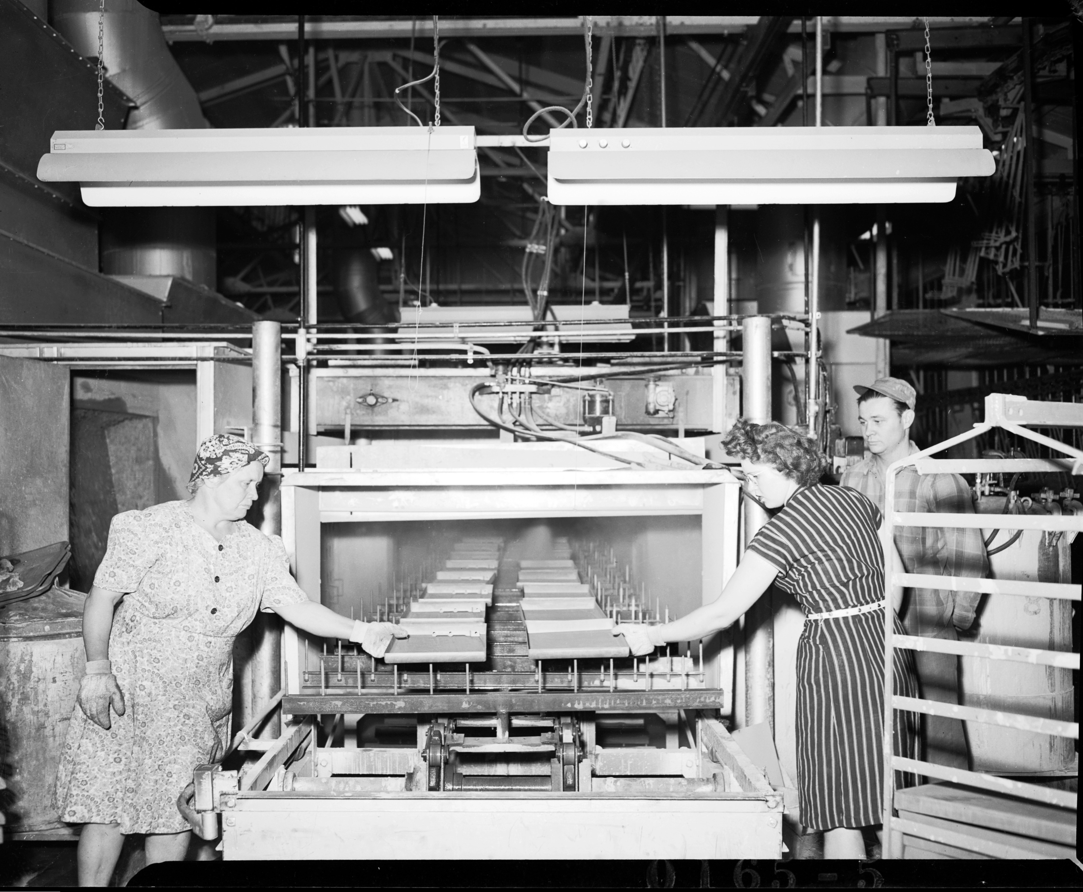 Industrial Scenes. Two women wearing dresses and work gloves, one in kerchief, pulling metal trays out of what appears to be an industrial spraying device at Kalamazoo Stove Company while male co-worker observes. Photograph shot for ""Mill & Factory"" magazine, showing post-war production. Overhead flourescent lights are visible. Client: D. G. Baird for ""Mill & Factory,"" Detroit, Michigan. (Photographic Negative)