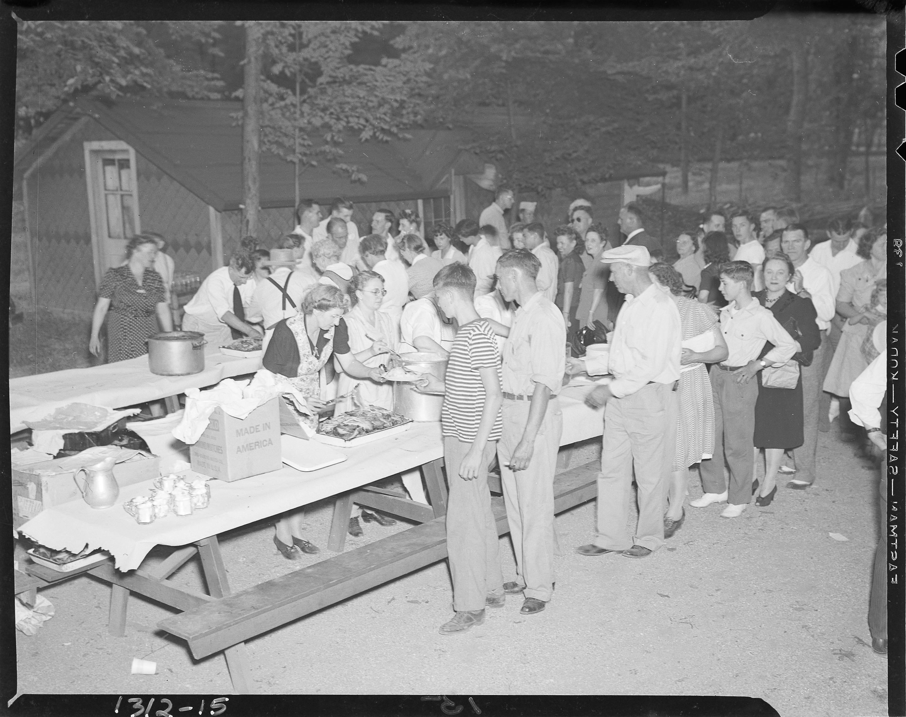 Events. Families going through buffet line at Ingersoll Steel Co. picnic. Client: Ingersoll Steel Co. (Photographic Negative)
