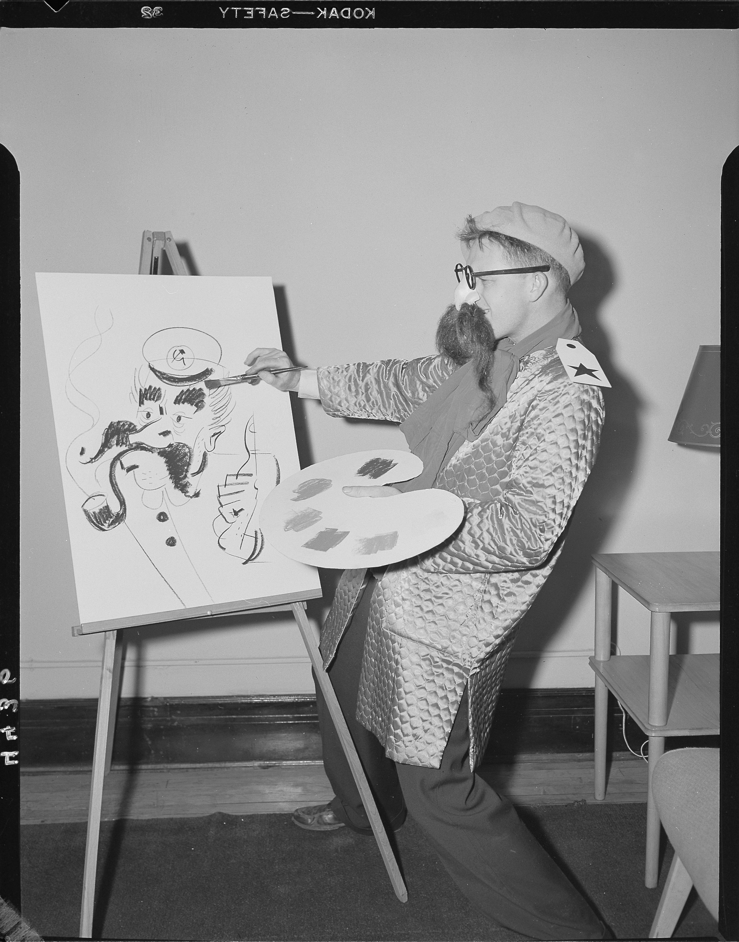 Events. Bob Bahlman drawing Stalin's image for ""Don't Vote."" Client: Junior Chamber of Commerce (Photographic Negative)