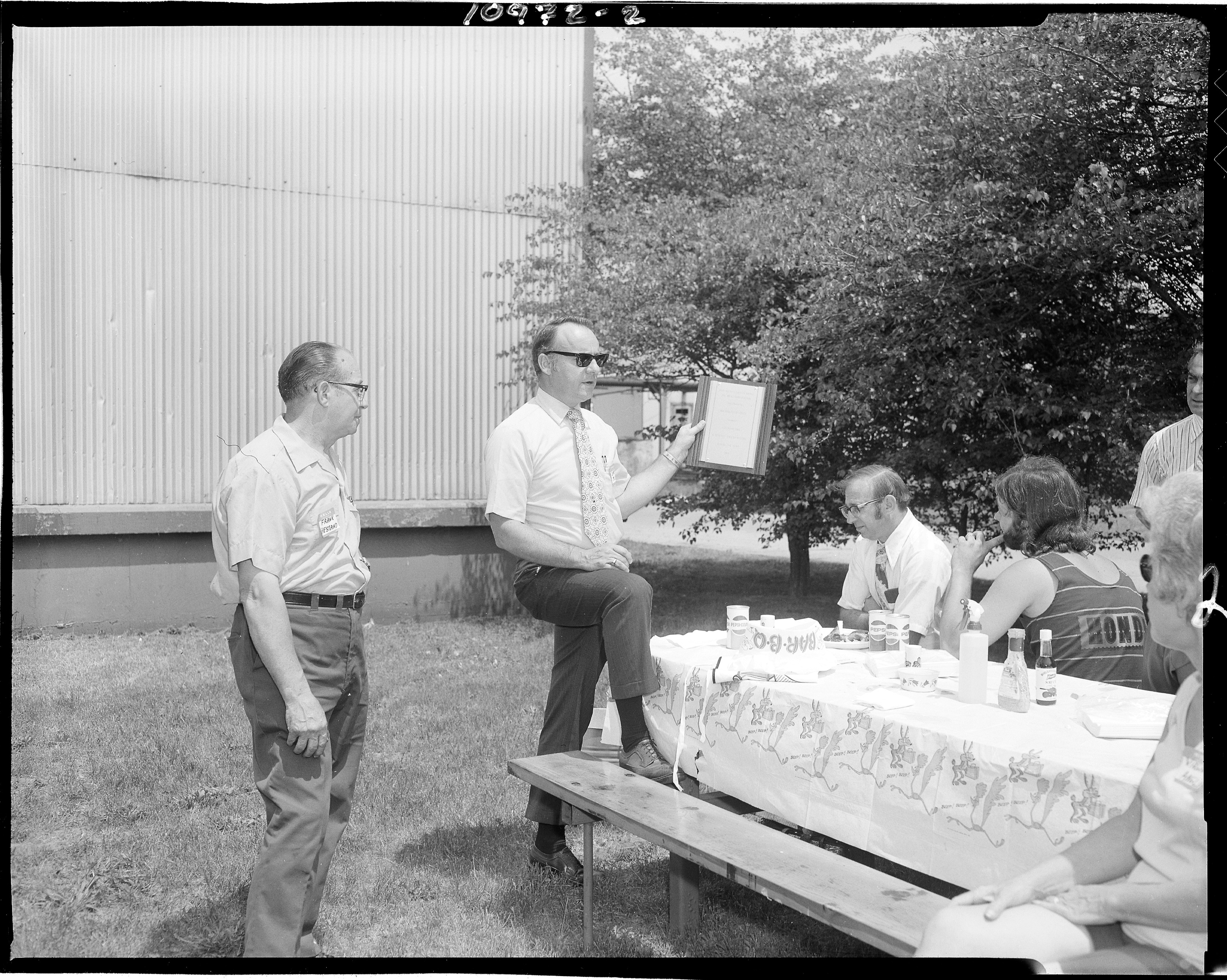 Events. Garth Miller holding award to be presented to Frank Hiestand at company picnic and award presentation. Client: Mead Container Corp., Tom Newman (Photographic Negative)