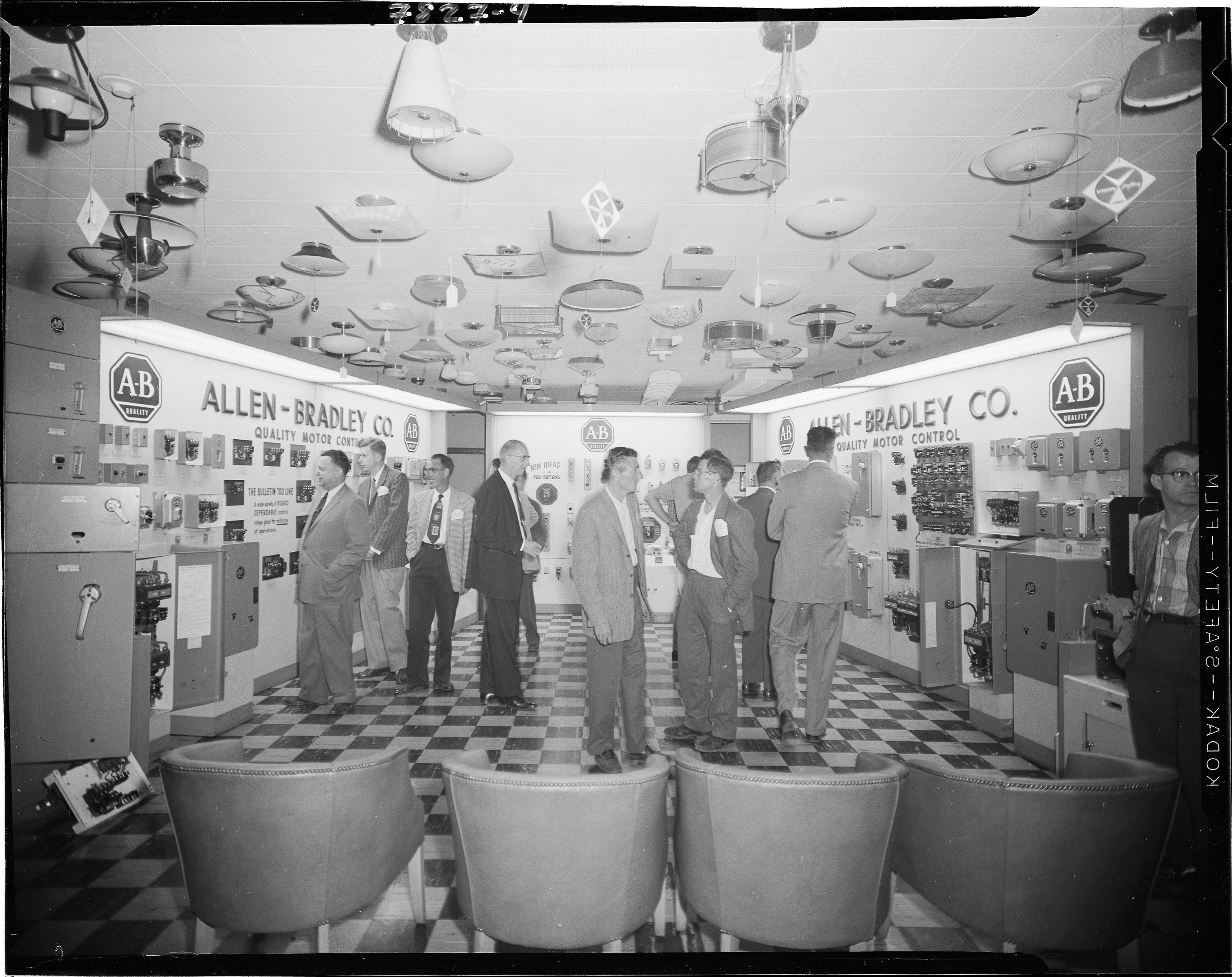 Events. Interior of L. R. Klose Electric Company during business meeting features ceiling lighting fixtures and displays for Allen-Bradley Company. Client: Klose Electric Co. (Photographic Negative)