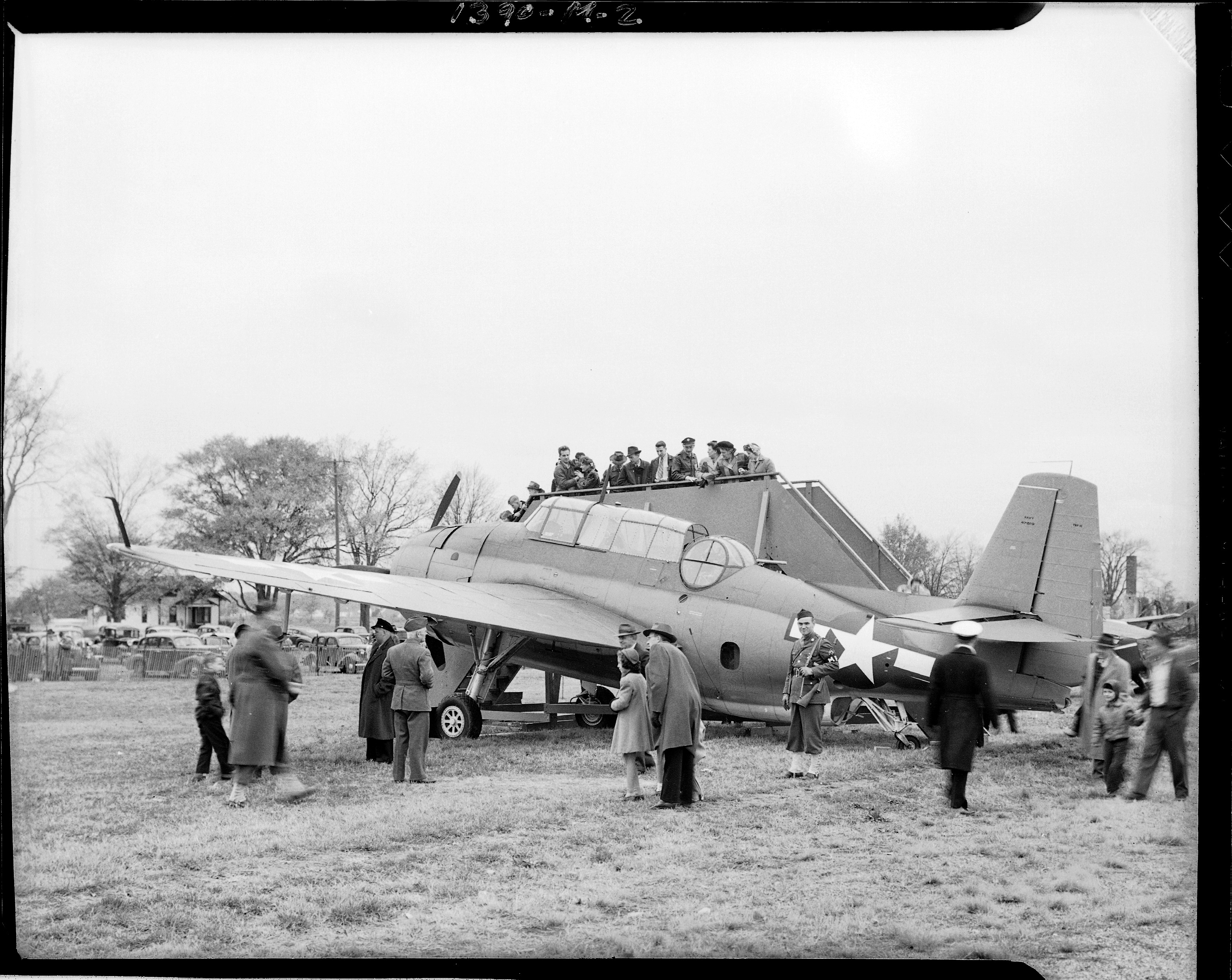 Events. People at Kalamazoo Airport looking at Grumman TBF Avenger aircraft. Client: Kalamazoo Stove Company, Kalamazoo, Michigan. (Photographic Negative)