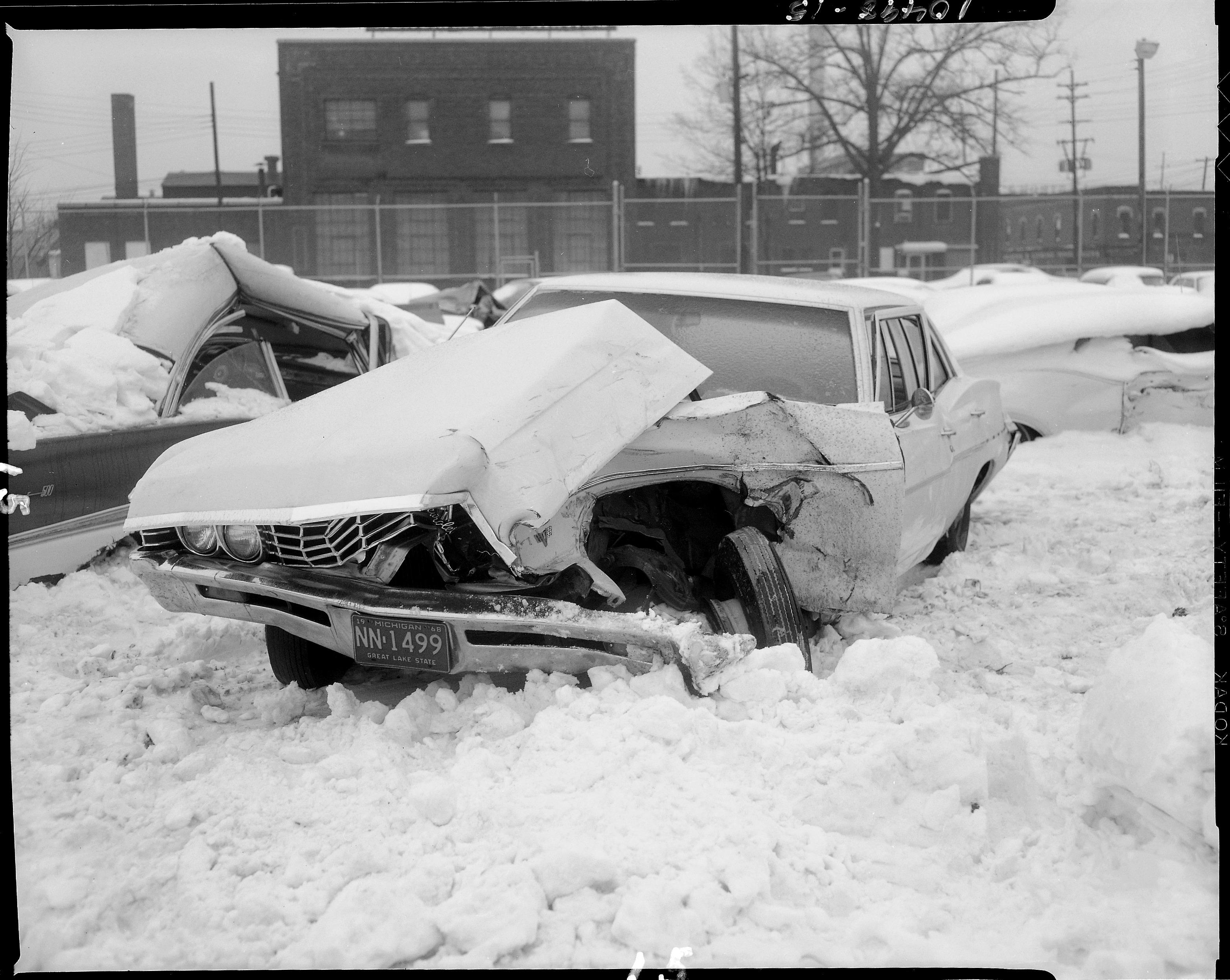 Insurance - Accidents. Wrecked automobile parked in snow in Kalamazoo city lot, 50 Mill Street. Client: Michigan Claim Service. (Photographic Negative)