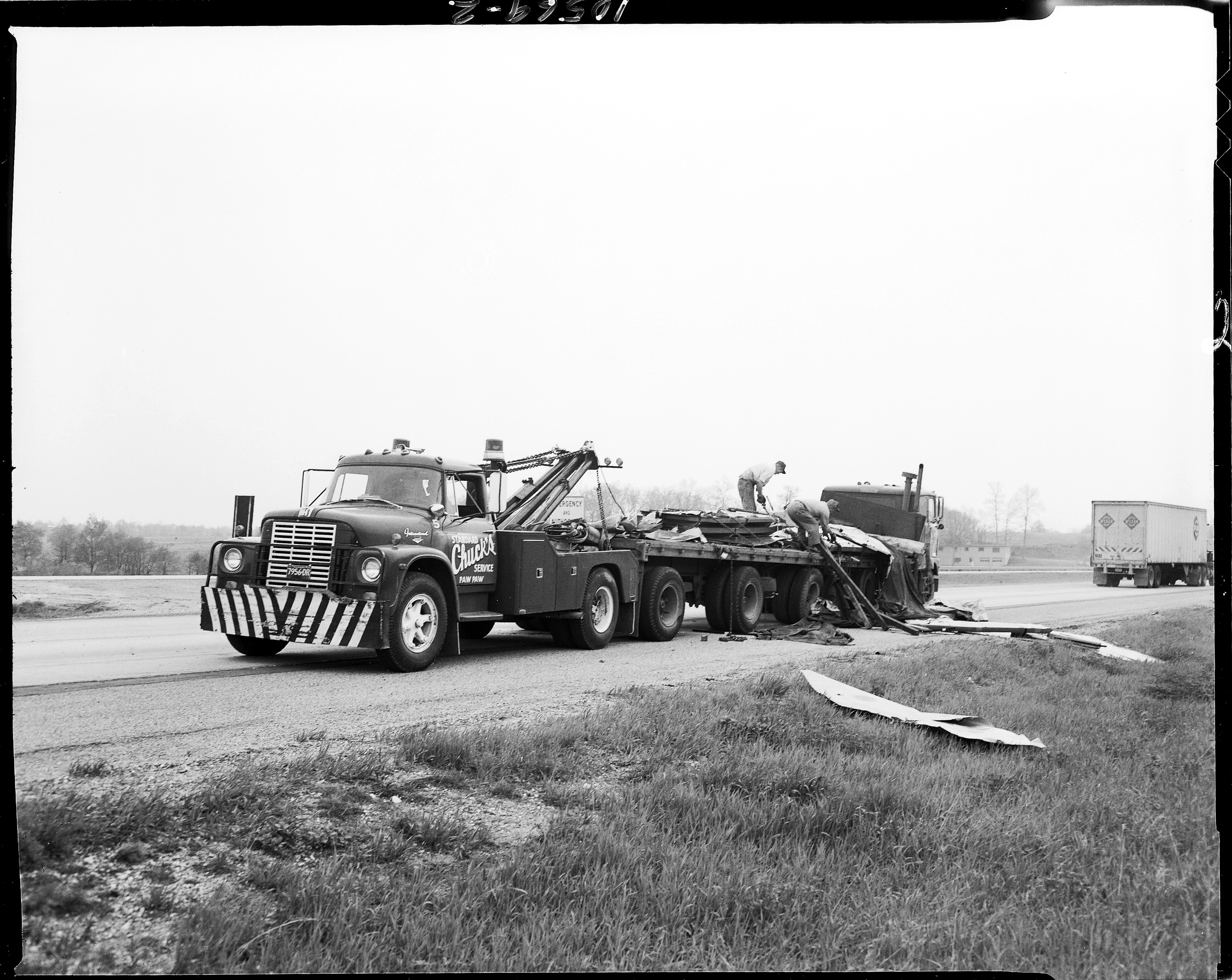 Insurance - Accidents. Tow truck from Chuck's Service, Paw Paw, MI. Accident scene on I-94 west of US 131 intersection. Kalamazoo County, MI. May 6, 1969. Client: Michigan Claim Service. (Photographic Negative)