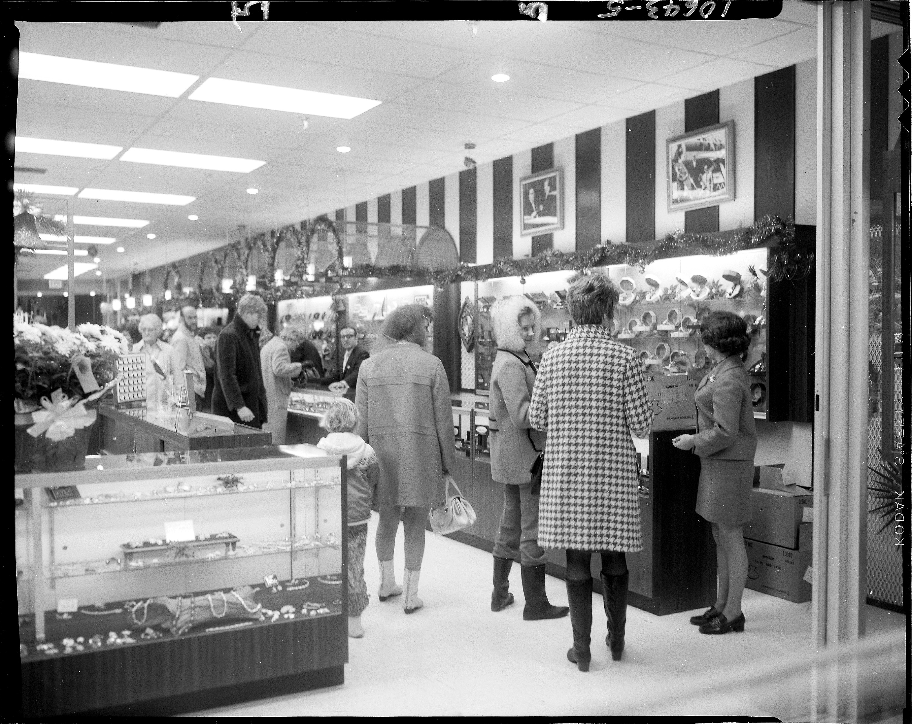 Business Scenes. People - Daily Life. Shoppers in winter clothing at Budd's Jewelers, A Division of Fox Jewelry Company, West Main Mall. Features store decorated for Christmas holidays. Client: Tom Fox, Kalamazoo, Michigan. (Photographic Negative)