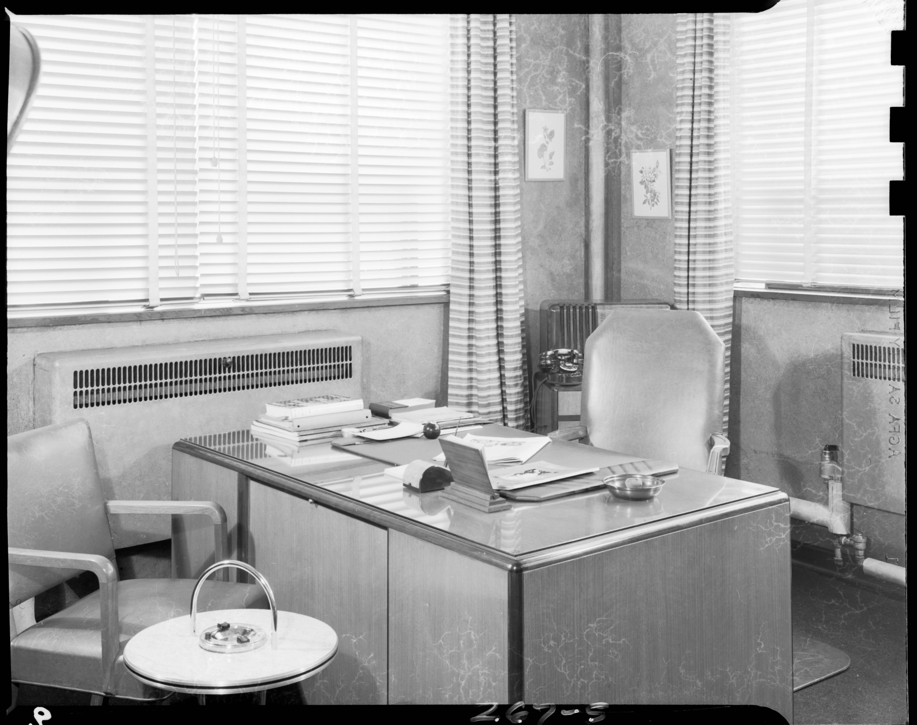 Business Scenes. Unidentified office includes desk, telephone, office furniture and venetian blinds. Client: Kirsch Company, Sturgis, Michigan (Photographic Negative)