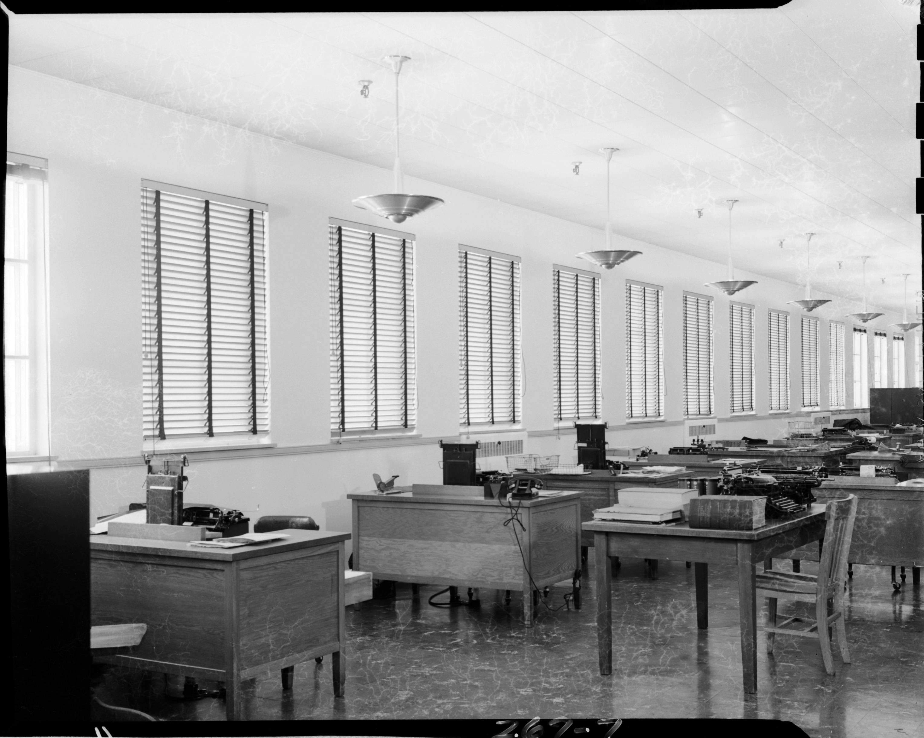 Business Scenes. Unidentified office interior includes desks, telephones, typewriters and venetian blinds. Client: Kirsch Company, Sturgis, Michigan (Photographic Negative)