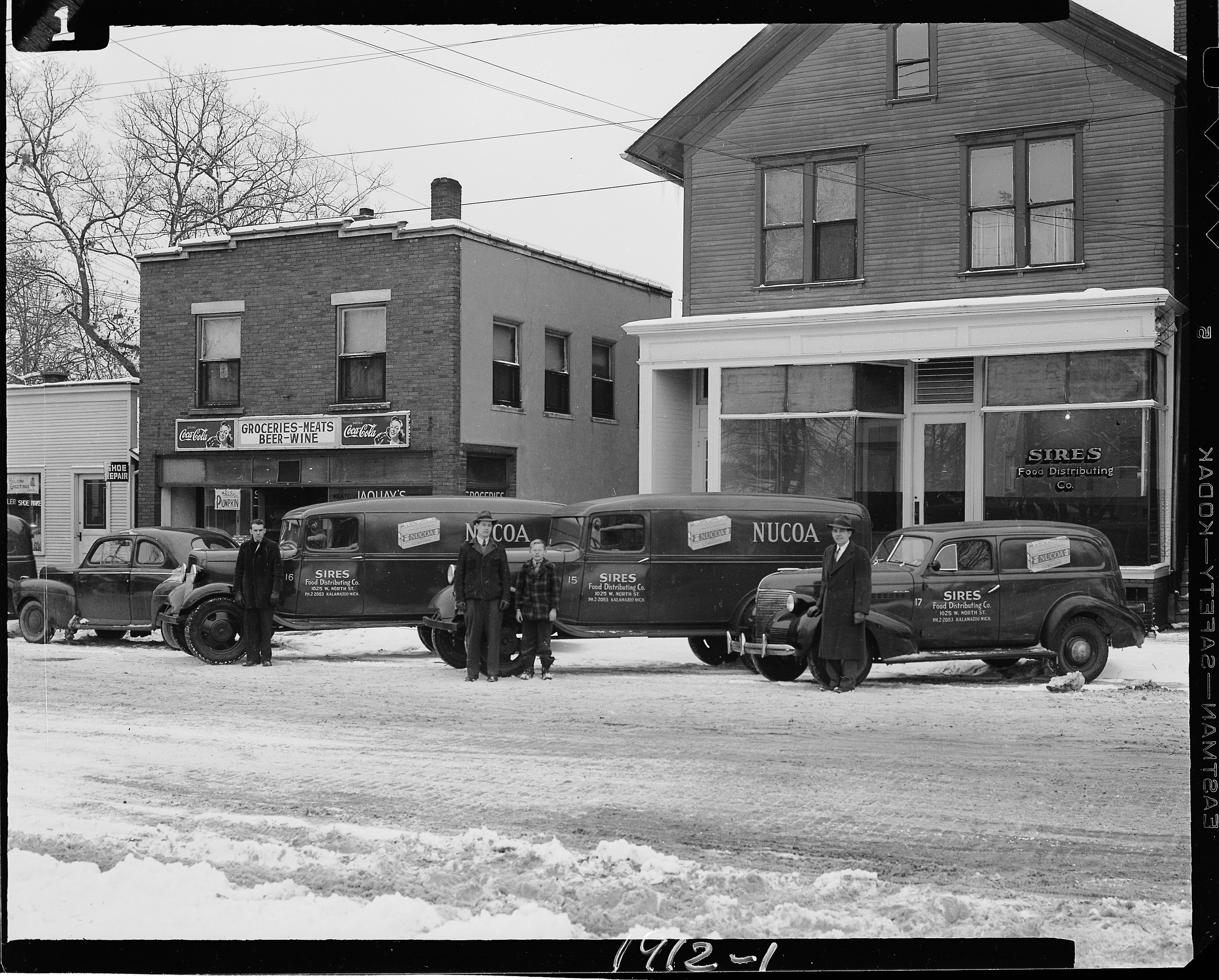 Business Scenes. Street Scenes - Service Stations. Men and delivery trucks and cars parked in 1000 block of W. North Street. Visible facades include Sires Food Distributing Company, 1025 W. North Street, Jaquays Grocer, 1023 W. North Street, and Leon T. Blum Shoe Repair, 1021 W. North Street. Client: Sires Food Service (Photographic Negative)