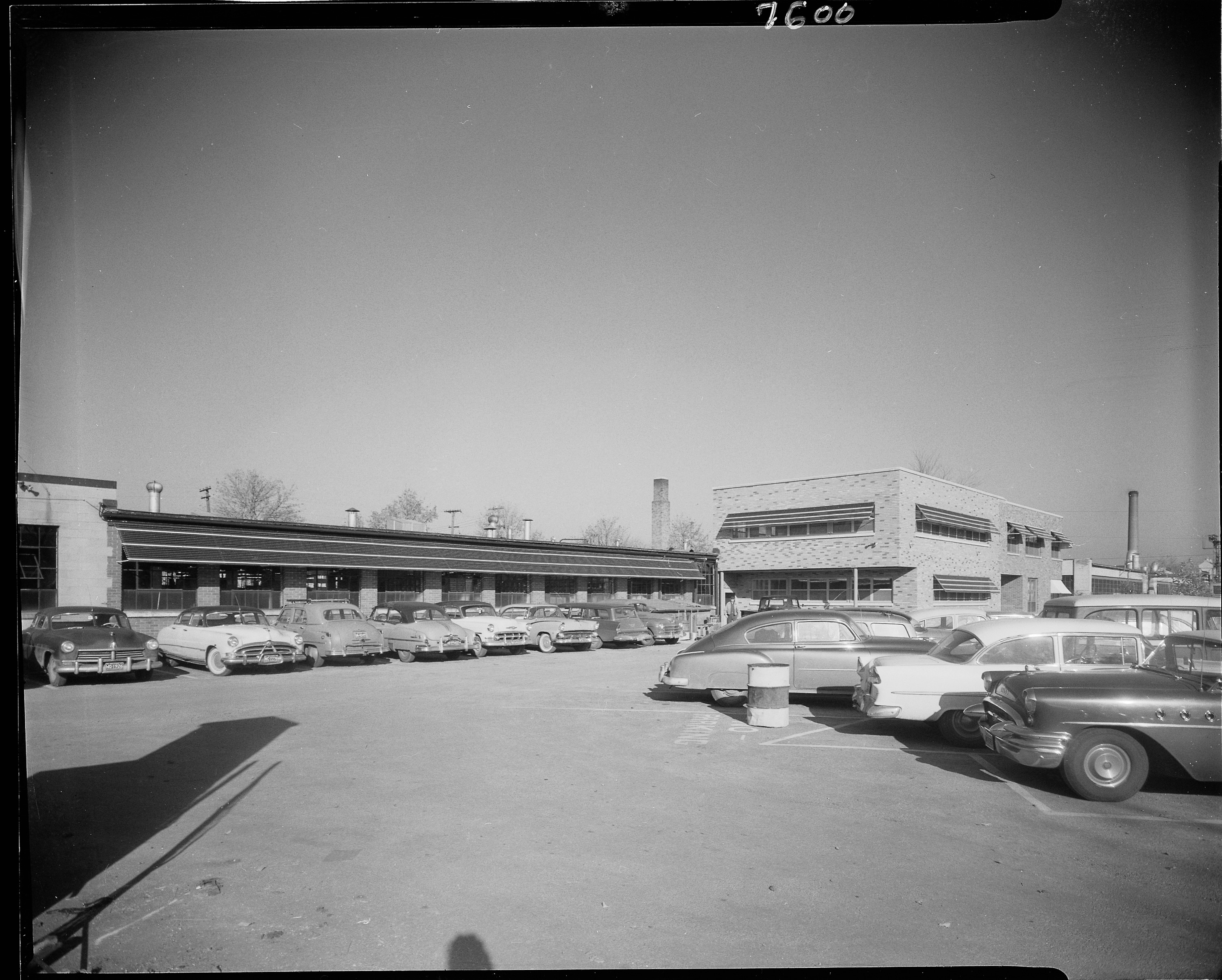 Business Scenes. Industrial Scenes. Durametallic Building and parking lot full of automobiles, 2104 Factory Street. Client: Kalamazoo Artcraft (Photographic Negative)