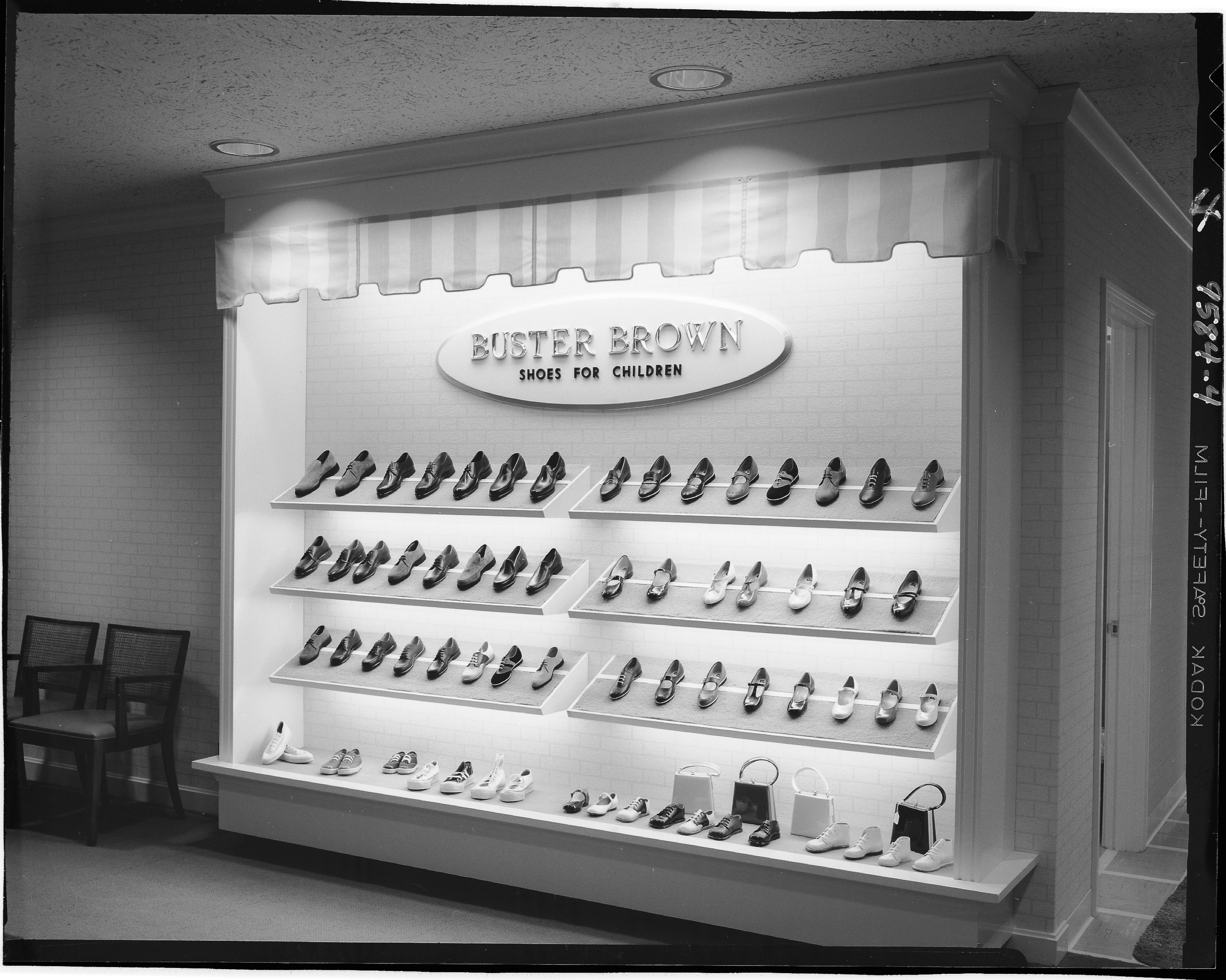 Business Scenes. Lighted display of Buster Brown children's shoes, both formal and informal, and girl's handbags, with chairs for fitting. Client: V&A Bootery, Kalamazoo, Michigan. (Photographic Negative)