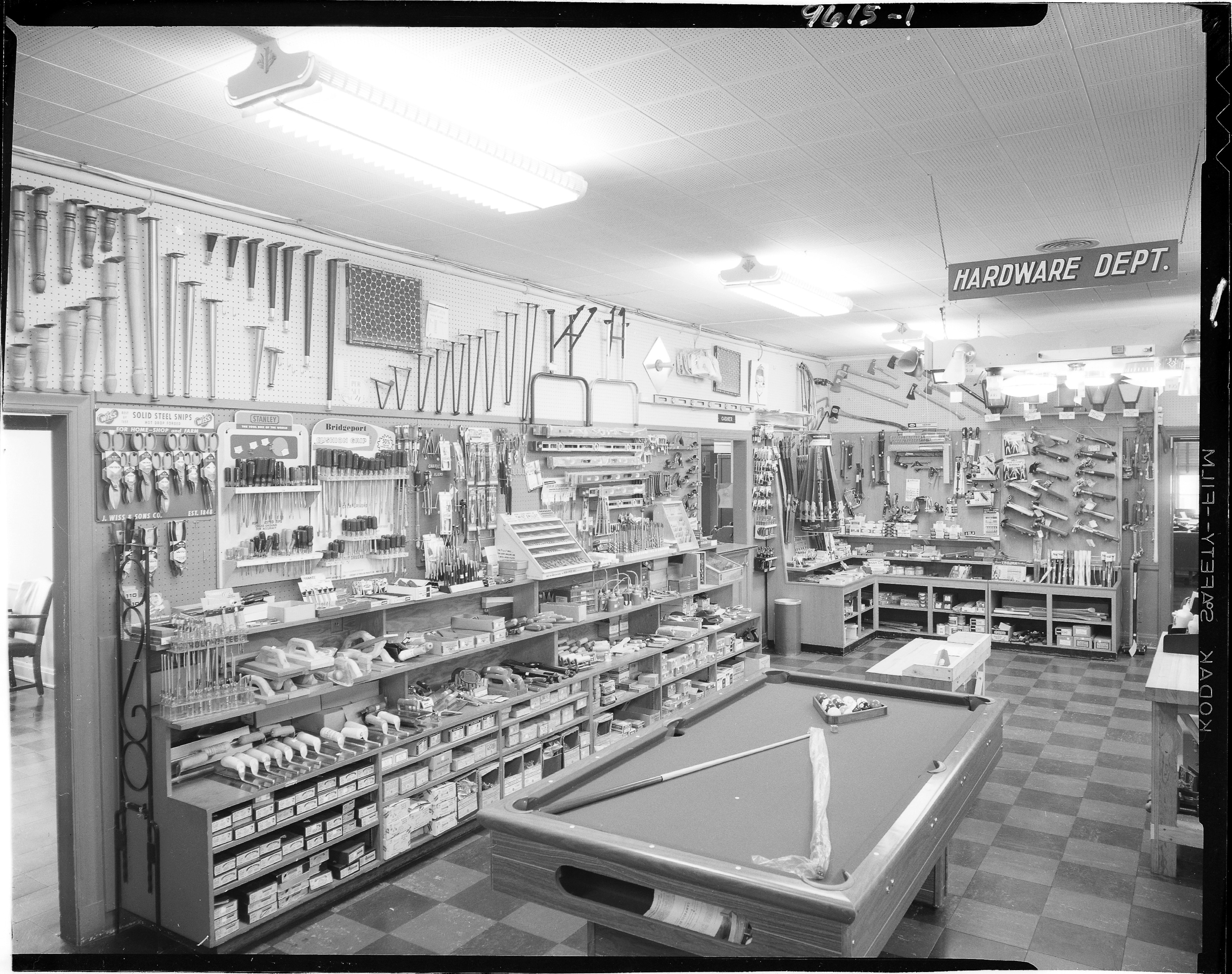 Business Scenes. Interior Miller Lumber Company sales room, 1919 Factory Street, includes hardware department sign, tools, and pool table display. Client: Miller Lumber Co. (Photographic Negative)